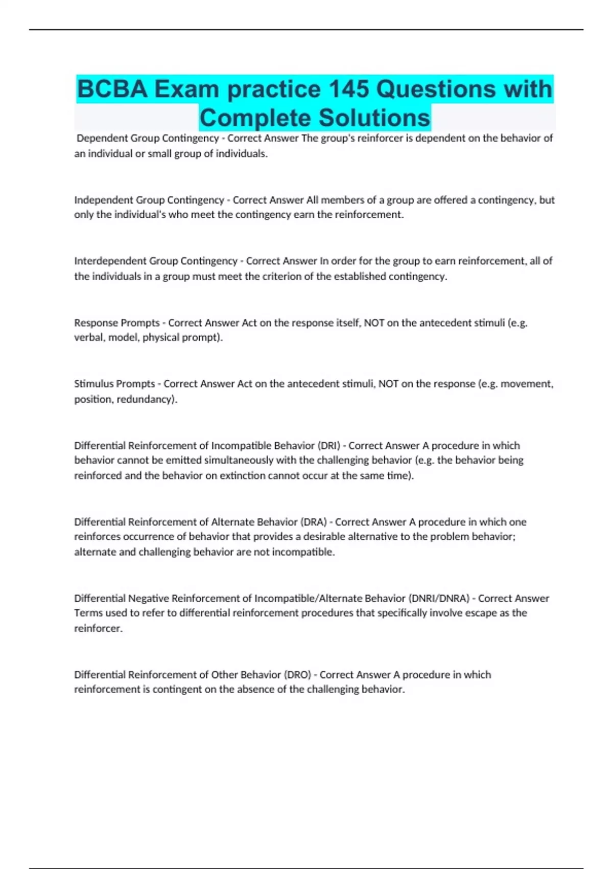 BCBA Exam practice 145 Questions with Complete Solutions Dependent Group Contingency - Correct Answer The group's reinforcer is dependent on the behavior of an individual or small group of individuals. Independent Group Contingency - Correct Answer All members of a group are offered a contingency, but only the individual's who meet the contingency earn the reinforcement. Interdependent Group Contingency - Correct Answer In order for the group to earn reinforcement, all of the individuals in a group must meet the criterion of the established contingency. Response Prompts - Correct Answer Act on the response itself, NOT on the antecedent stimuli (e.g. verbal, model, physical prompt). Stimulus Prompts - Correct Answer Act on the antecedent stimuli, NOT on the response (e.g. movement, position, redundancy). Differential Reinforcement of Incompatible Behavior (DRI) - Correct Answer A procedure in which behavior cannot be emitted simultaneously with the challenging behavior (e.g. the behavior being reinforced and the behavior on extinction cannot occur at the same time). Differential Reinforcement of Alternate Behavior (DRA) - Correct Answer A procedure in which one reinforces occurrence of behavior that provides a desirable alternative to the problem behavior; alternate and challenging behavior are not incompatible. Differential Negative Reinforcement of Incompatible/Alternate Behavior (DNRI/DNRA) - Correct Answer Terms used to refer to differential reinforcement procedures that specifically involve escape as the reinforcer. Differential Reinforcement of Other Behavior (DRO) - Correct Answer A procedure in which reinforcement is contingent on the absence of the challenging behavior.