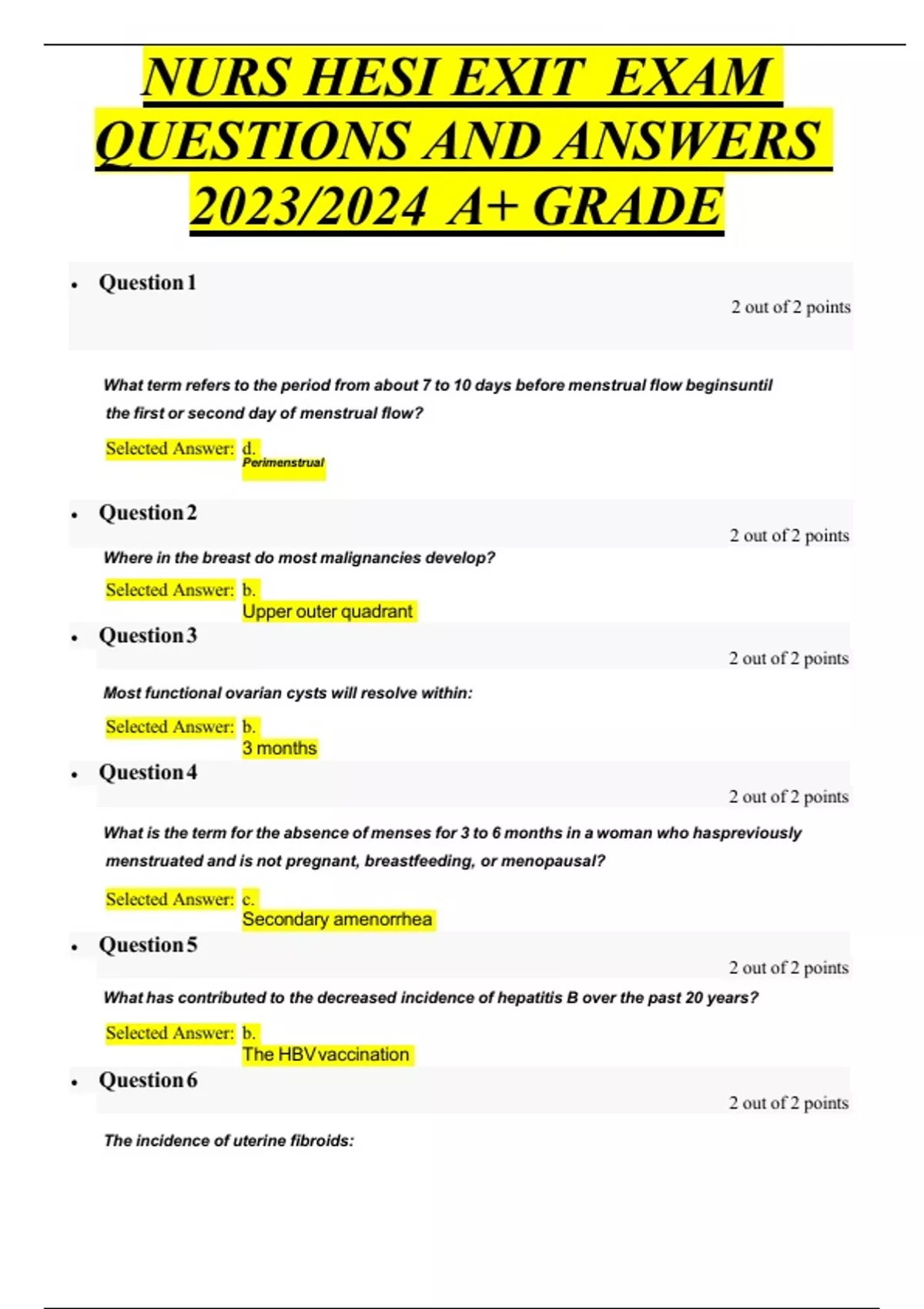 NURS HESI EXIT EXAM QUESTIONS AND ANSWERS 2023/2024 A+ GRADE What term refers to the period from about 7 to 10 days before menstrual flow beginsuntil the first or second day of menstrual flow? Where in the breast do most malignancies develop? What is the term for the absence of menses for 3 to 6 months in a woman who haspreviously menstruated and is not pregnant, breastfeeding, or menopausal? What has contributed to the decreased incidence of hepatitis B over the past 20 years? The incidence of uterine fibroids: Which one of the following statements about the subdermal progestin implant is false?