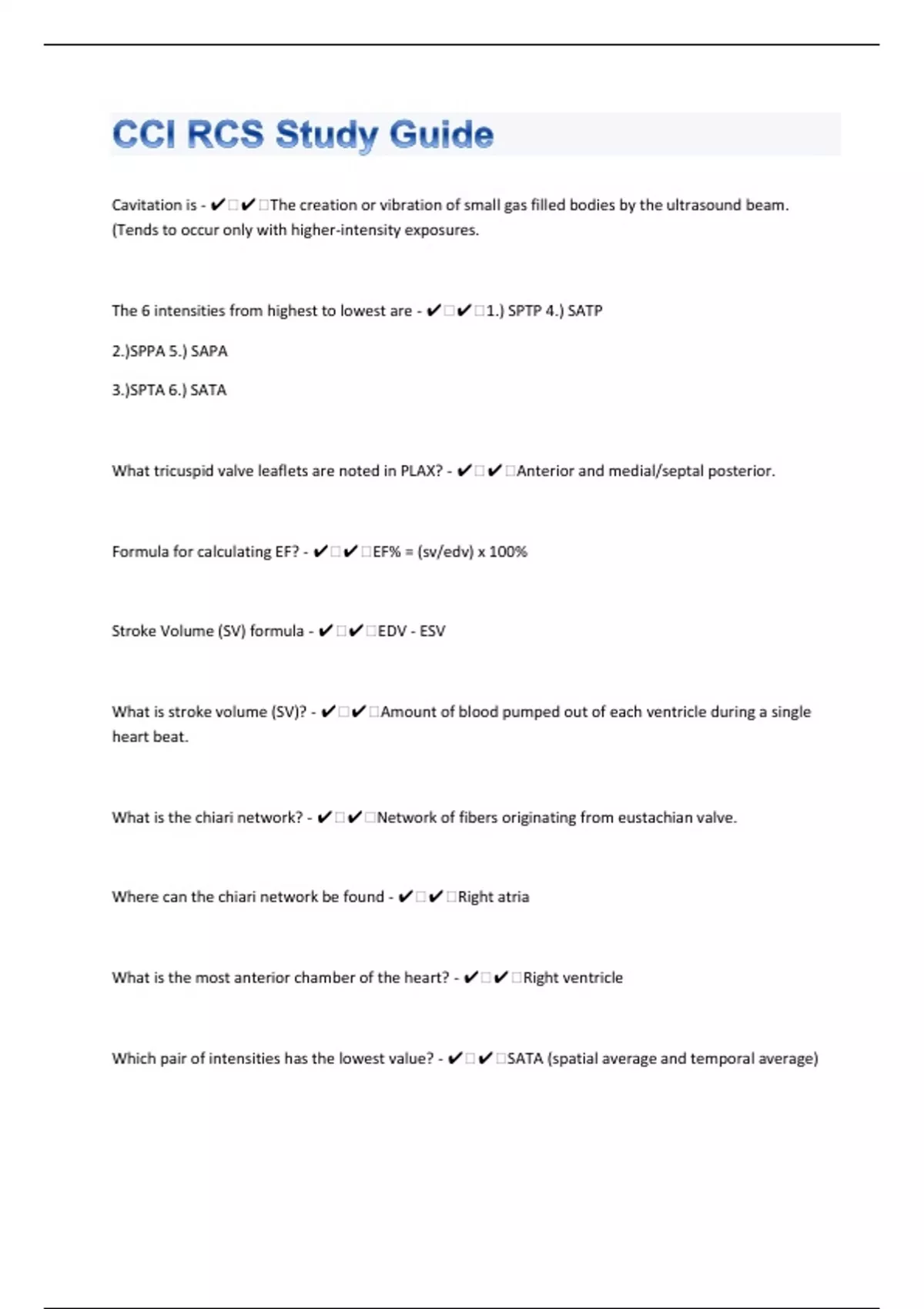 Cavitation is - ️️The creation or vibration of small gas filled bodies by the ultrasound beam. (Tends to occur only with higher-intensity exposures. The 6 intensities from highest to lowest are - ️️1.) SPTP 4.) SATP 2.)SPPA 5.) SAPA 3.)SPTA 6.) SATA What tricuspid valve leaflets are noted in PLAX? - ️️Anterior and medial/septal posterior. Formula for calculating EF? - ️️EF% = (sv/edv) x 100% Stroke Volume (SV) formula - ️️EDV - ESV What is stroke volume (SV)? - ️️Amount of blood pumped out of each ventricle during a single heart beat. What is the chiari network? - ️️Network of fibers originating from eustachian valve. Where can the chiari network be found - ️️Right atria What is the most anterior chamber of the heart? - ️️Right ventricle Which pair of intensities has the lowest value? - ️️SATA (spatial average and temporal average)