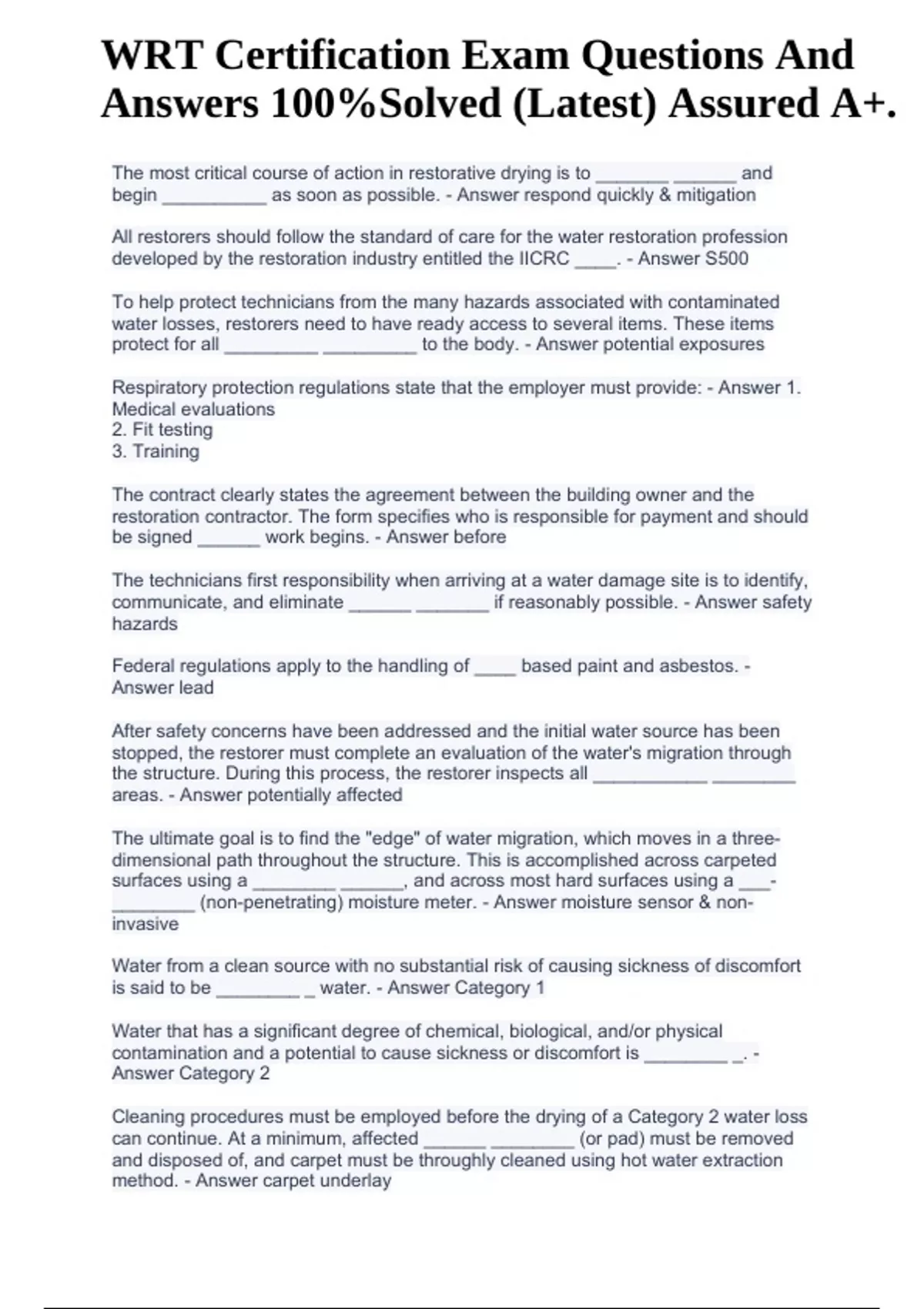 WRT Certification Exam Questions And Answers 100%Solved (Latest) Assured A+. The most critical course of action in restorative drying is to _______ ______ and begin __________ as soon as possible. - Answer respond quickly & mitigation All restorers should follow the standard of care for the water restoration profession developed by the restoration industry entitled the IICRC ____. - Answer S500 To help protect technicians from the many hazards associated with contaminated water losses, restorers need to have ready access to several items. These items protect for all _________ _________ to the body. - Answer potential exposures Respiratory protection regulations state that the employer must provide: - Answer 1. Medical evaluations 2. Fit testing 3. Training The contract clearly states the agreement between the building owner and the restoration contractor. The form specifies who is responsible for payment and should be signed ______ work begins. - Answer before The technicians first responsibility when arriving at a water damage site is to identify, communicate, and eliminate ______ _______ if reasonably possible. - Answer safety hazards Federal regulations apply to the handling of ____ based paint and asbestos. - Answer lead After safety concerns have been addressed and the initial water source has been stopped, the restorer must complete an evaluation of the water's migration through the structure. During this process, the restorer inspects all ___________ ________ areas. - Answer potentially affected The ultimate goal is to find the "edge" of water migration, which moves in a threedimensional path throughout the structure. This is accomplished across carpeted surfaces using a ________ ______, and across most hard surfaces using a ___- ________ (non-penetrating) moisture meter. - Answer moisture sensor & noninvasive Water from a clean source with no substantial risk of causing sickness of discomfort is said to be ________ _ water. - Answer Category 1 Water that has a significant degree of chemical, biological, and/or physical contamination and a potential to cause sickness or discomfort is ________ _. - Answer Category 2 Cleaning procedures must be employed before the drying of a Category 2 water loss can continue. At a minimum, affected ______ ________ (or pad) must be removed and disposed of, and carpet must be throughly cleaned using hot water extraction method. - Answer carpet underlay .