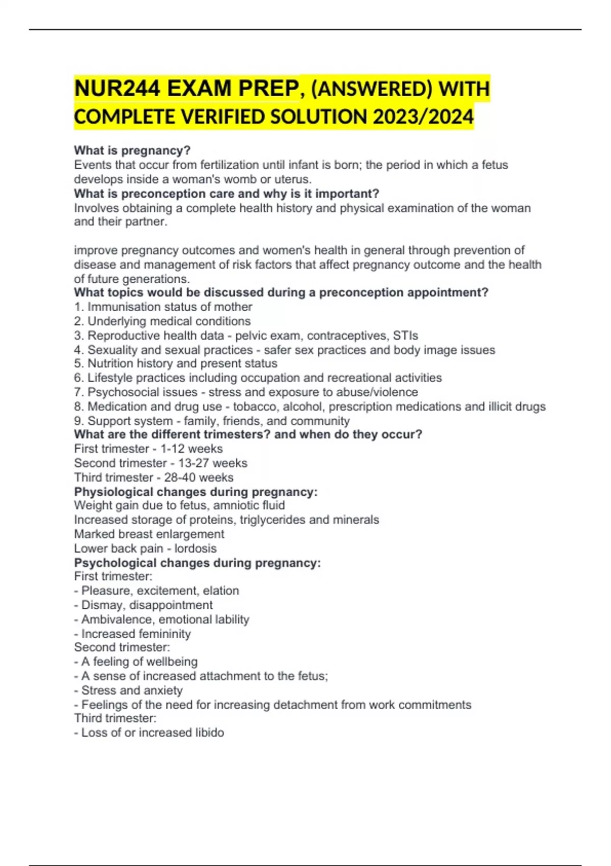 NUR244 EXAM PREP, (ANSWERED) WITH COMPLETE VERIFIED SOLUTION 2023/2024 What is pregnancy? Events that occur from fertilization until infant is born; the period in which a fetus develops inside a woman's womb or uterus. What is preconception care and why is it important? Involves obtaining a complete health history and physical examination of the woman and their partner. improve pregnancy outcomes and women's health in general through prevention of disease and management of risk factors that affect pregnancy outcome and the health of future generations. What topics would be discussed during a preconception appointment? 1. Immunisation status of mother 2. Underlying medical conditions 3. Reproductive health data - pelvic exam, contraceptives, STIs 4. Sexuality and sexual practices - safer sex practices and body image issues 5. Nutrition history and present status 6. Lifestyle practices including occupation and recreational activities 7. Psychosocial issues - stress and exposure to abuse/violence 8. Medication and drug use - tobacco, alcohol, prescription medications and illicit drugs 9. Support system - family, friends, and community What are the different trimesters? and when do they occur? First trimester - 1-12 weeks Second trimester - 13-27 weeks Third trimester - 28-40 weeks Physiological changes during pregnancy: Weight gain due to fetus, amniotic fluid Increased storage of proteins, triglycerides and minerals Marked breast enlargement Lower back pain - lordosis Psychological changes during pregnancy: First trimester: - Pleasure, excitement, elation - Dismay, disappointment - Ambivalence, emotional lability - Increased femininity Second trimester: - A feeling of wellbeing - A sense of increased attachment to the fetus; - Stress and anxiety - Feelings of the need for increasing detachment from work commitments Third trimester: - Loss of or increased libido