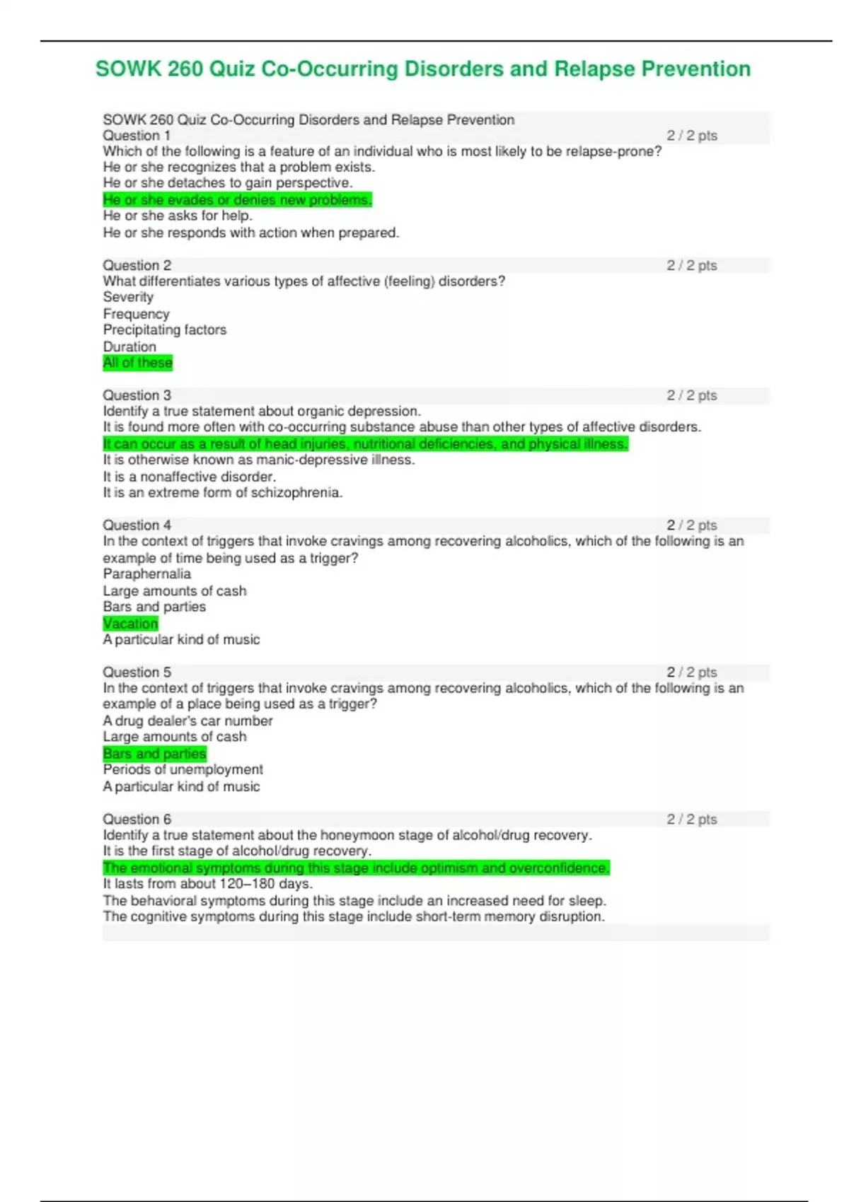 SOWK 260 Co-Occurring Disorders and Relapse Prevention Answered Questions with 100% Correct Solutions