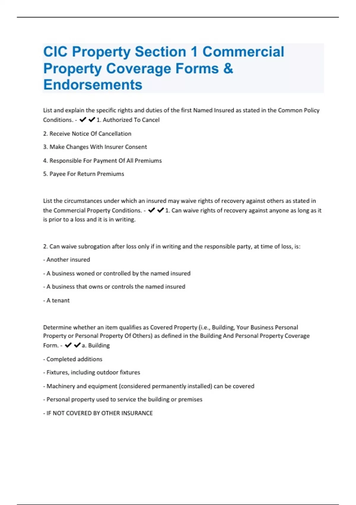 CIC Property Section 1 Commercial Property Coverage Forms & Endorsements Questions & Answers Solved 100% Correct!!