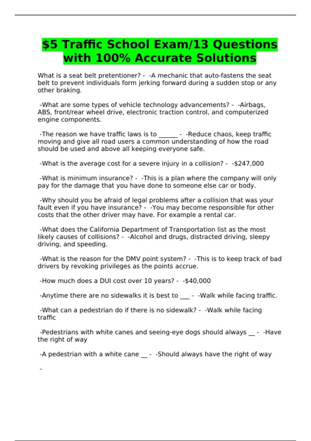 $5 Traffic School Exam/13 Questions with 100% Accurate Solutions