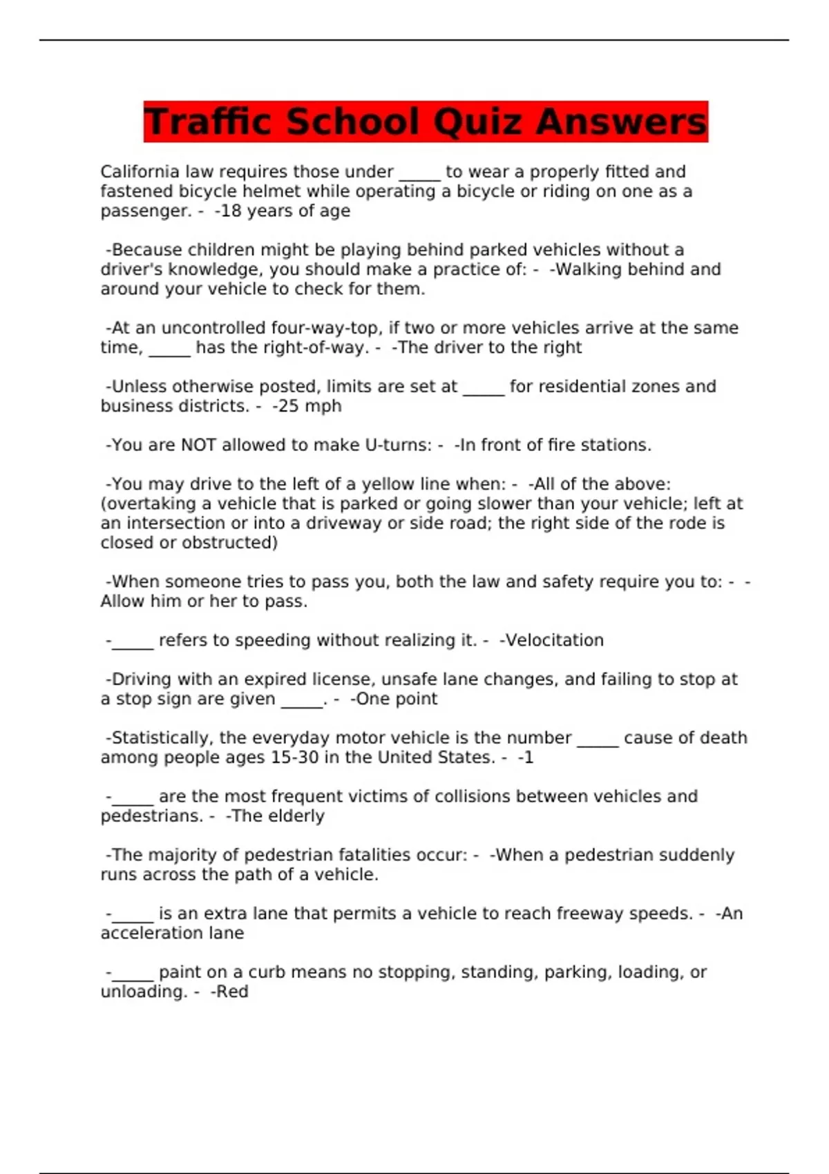Traffic School Quiz Answers