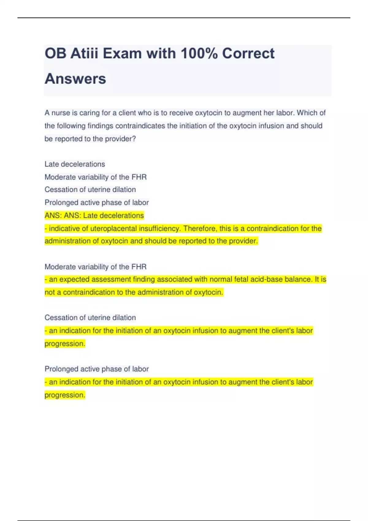 OB Atiii Exam with 100% Correct Answers A nurse is caring for a client who is to receive oxytocin to augment her labor. Which of the following findings contraindicates the initiation of the oxytocin infusion and should be reported to the provider? Late decelerations Moderate variability of the FHR Cessation of uterine dilation Prolonged active phase of labor ANS: ANS: Late decelerations - indicative of uteroplacental insufficiency. Therefore, this is a contraindication for the administration of oxytocin and should be reported to the provider. Moderate variability of the FHR - an expected assessment finding associated with normal fetal acid-base balance. It is not a contraindication to the administration of oxytocin. Cessation of uterine dilation - an indication for the initiation of an oxytocin infusion to augment the client's labor progression. Prolonged active phase of labor - an indication for the initiation of an oxytocin infusion to augment the client's labor progression