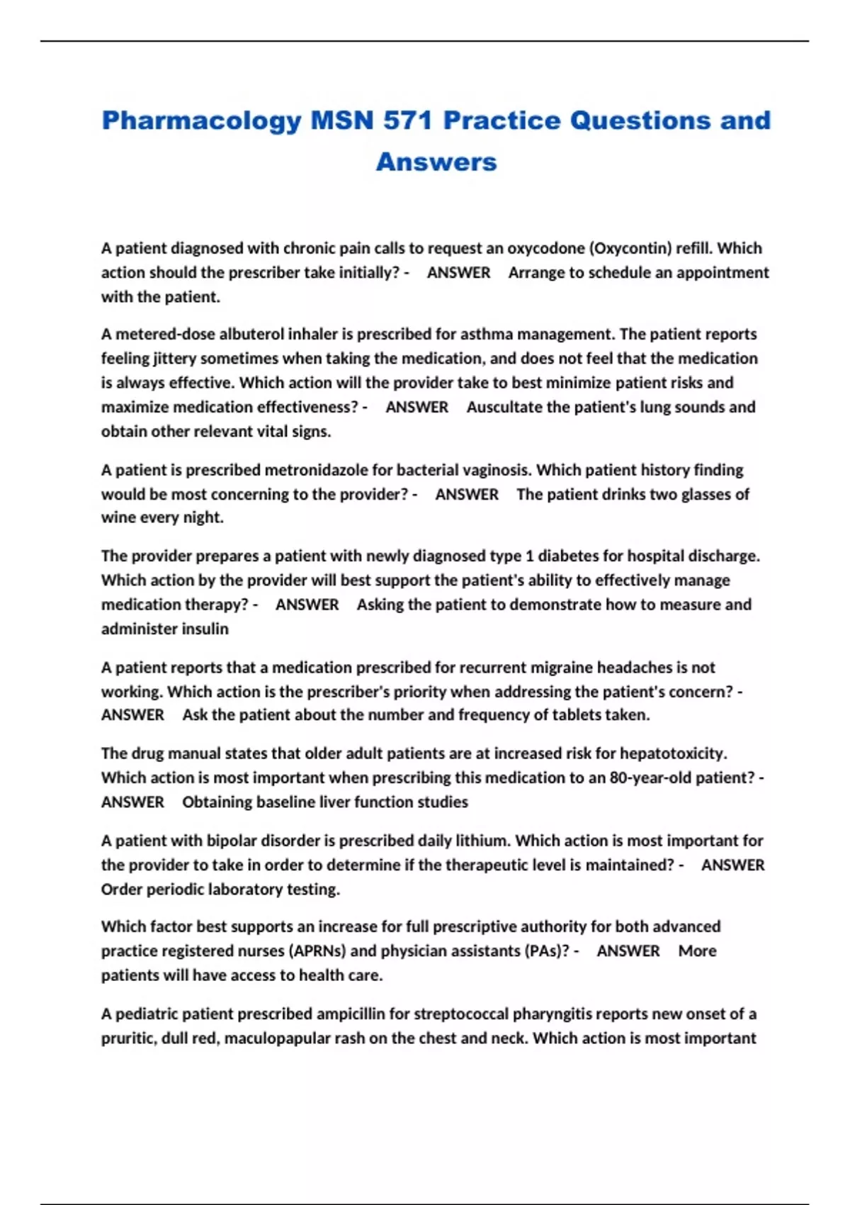 Pharmacology MSN 571 Practice Questions and Answers