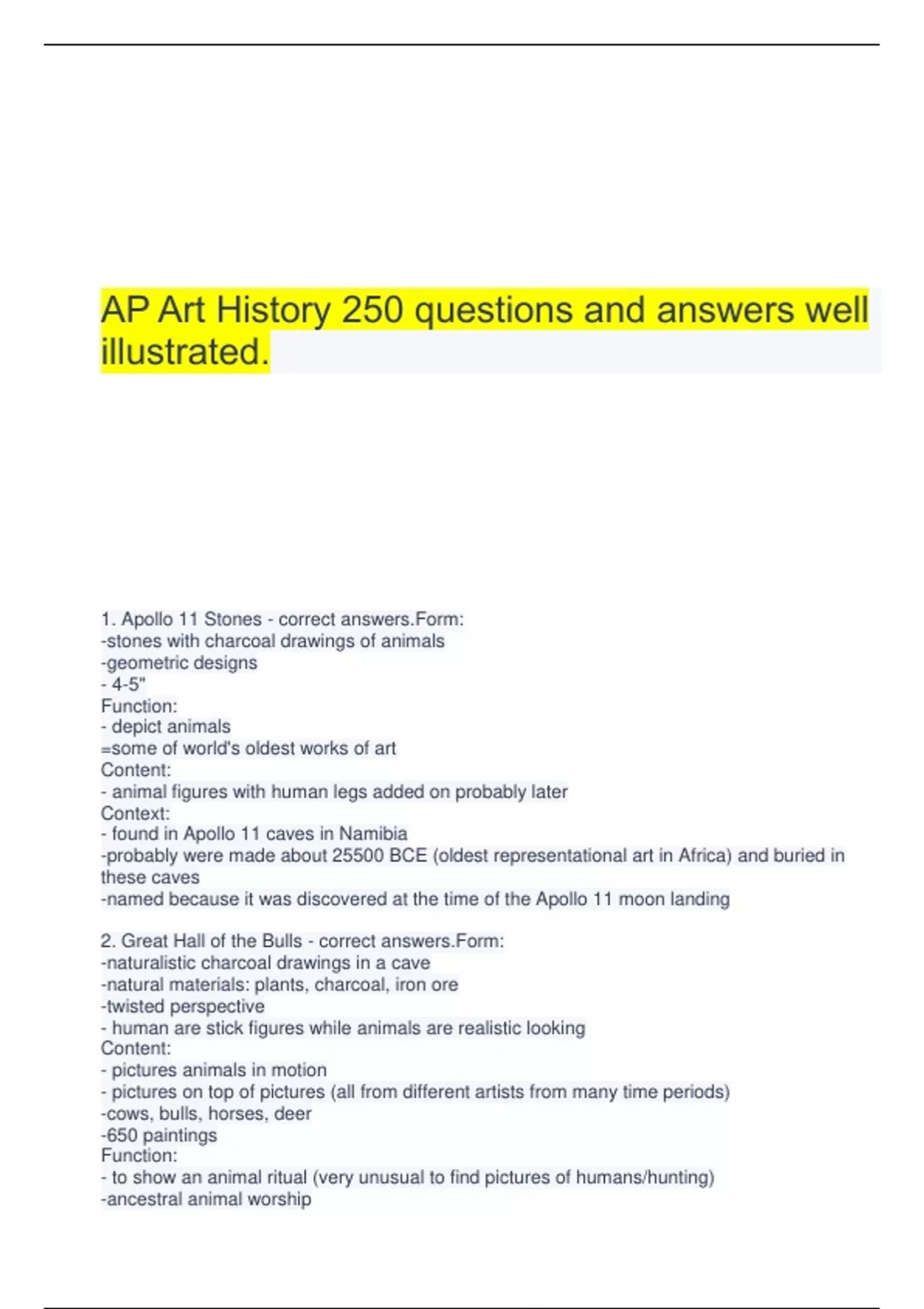 AP Art History 250 questions and answers well illustrated. 1. Apollo 11 Stones - correct answers.Form: -stones with charcoal drawings of animals -geometric designs - 4-5" Function: - depict animals =some of world's oldest works of art Content: - animal figures with human legs added on probably later Context: - found in Apollo 11 caves in Namibia -probably were made about 25500 BCE (oldest representational art in Africa) and buried in these caves -named because it was discovered at the time of the Apollo 11 moon landing 2. Great Hall of the Bulls - correct answers.Form: -naturalistic charcoal drawings in a cave -natural materials: plants, charcoal, iron ore -twisted perspective - human are stick figures while animals are realistic looking Content: - pictures animals in motion - pictures on top of pictures (all from different artists from many time periods) -cows, bulls, horses, deer -650 paintings Function: - to show an animal ritual (very unusual to find pictures of humans/hunting) -ancestral animal worship Context: -sacred place (deep in a cave)- in situ -not a dwelling because the creators of these were nomads -Paleolithic Europe- Lascaux, France 3. Camelid sacrum - correct answers.Form: - carved bone Function: -spiritual mask -house spiritual essence of a hunted animal -sacrum bone powerful symbolism of Osiris and rebirth- triangle Content: - sacrum bone (hip bone) carved in shape of a canine/wolf Context: -found in a tomb in Mexico (MesoAmerica) - BCE 4. Running horned woman - correct answers.Form: - canyon painting (layers of painting from different times so makes it hard for carbon dating) -depicts motion Function; - show this person as holy or a god bc of the horns Content: - shows a woman with horns running - dots on her body represent body painting - shows a deity wearing ceremonial headgear? Context: - in situ on canyon walls in the Sahara - BCE (neolithic) 5. Bushel with ibex motifs - correct answers.Form: -painted terra cotta, clay - geometric forms - set in registers, controlled and repeated planar composition Function: -funerary object Content: -dog figures, mountain goat, cranes Context: - Susa, Iran in BCE -neolithic -new technology: use of potter's wheel 6. Anthropomorphic stele - correct answers.Form: -sandstone Content: - 3 of them all 3ft tall -belted robe with knife hanging from it Function: - used in incense trade -religious/burial practices Context: -found on trade routes in the Arabian Peninsula, Saudi Arabia -fourth millennium