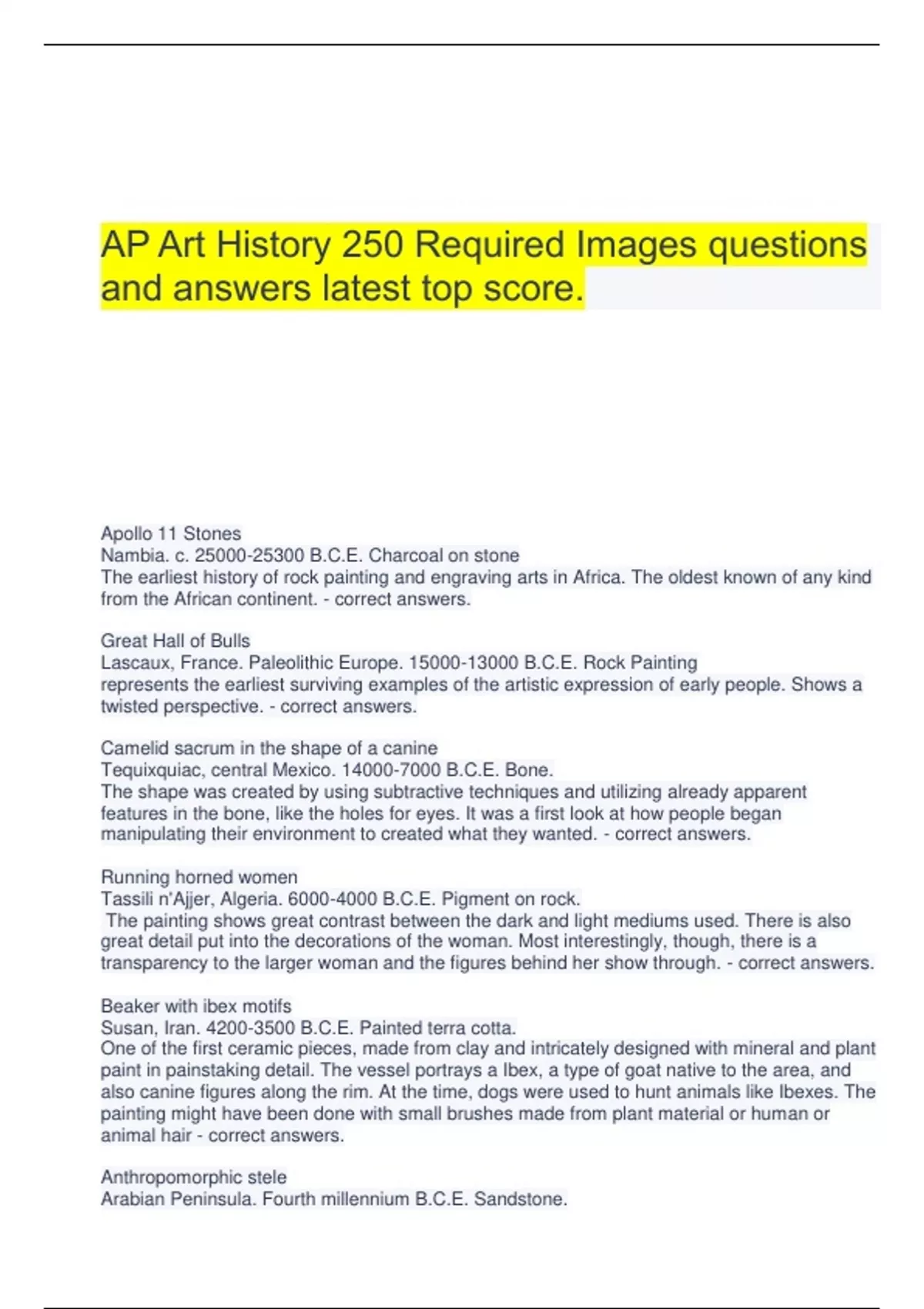 AP Art History 250 Required Images questions and answers latest top score. Apollo 11 Stones Nambia. c. B.C.E. Charcoal on stone The earliest history of rock painting and engraving arts in Africa. The oldest known of any kind from the African continent. - correct answers. Great Hall of Bulls Lascaux, France. Paleolithic Europe. B.C.E. Rock Painting represents the earliest surviving examples of the artistic expression of early people. Shows a twisted perspective. - correct answers. Camelid sacrum in the shape of a canine Tequixquiac, central Mexico. B.C.E. Bone. The shape was created by using subtractive techniques and utilizing already apparent features in the bone, like the holes for eyes. It was a first look at how people began manipulating their environment to created what they wanted. - correct answers. Running horned women Tassili n'Ajjer, Algeria. B.C.E. Pigment on rock. The painting shows great contrast between the dark and light mediums used. There is also great detail put into the decorations of the woman. Most interestingly, though, there is a transparency to the larger woman and the figures behind her show through. - correct answers. Beaker with ibex motifs Susan, Iran. B.C.E. Painted terra cotta. One of the first ceramic pieces, made from clay and intricately designed with mineral and plant paint in painstaking detail. The vessel portrays a Ibex, a type of goat native to the area, and also canine figures along the rim. At the time, dogs were used to hunt animals like Ibexes. The painting might have been done with small brushes made from plant material or human or animal hair - correct answers. Anthropomorphic stele Arabian Peninsula. Fourth millennium B.C.E. Sandstone. Very stylized representation of a human figure, carved from stone. Has a make image and carries knives in sheaths across the chest and a knife tucked into a belt. - correct answers. Jade cong Liangzhu, China. B.C.E. Carved jade. Like one of many, this was a jade piece with decorative carvings, unique shape, and symbolic purpose. The stone might have held spiritual or symbolic meanings to the early cultures of China. - correct answers. Stonehenge Wiltshire, U.K. Neolithic Europe. c. B.C.E. Sandstone Stonehenge is a famous site know for its large circles of massive stones in a seemingly random location as well as the mystery surrounding how and why it was built. The stones are believed to be from local quarries and farther off mountains. There is also evidence of mud, wood, and ropes assisting in the construction of the site. - correct answers. The Ambum Stone Ambum Valley, Enga Province, Papua New Guinea. c. 1500 B.C.E. Greywacke This is a sculpture of some sort of anteater-like creature made from a very rounded stone. With intense use of subtractive sculpting, this piece achieves a freestanding neck and head while still maintaining much of the original shape of the stone. It still uses natural materials and depicts a natural animal. - correct answers. Tlatilco female figurine Central Mexico, site of Tlatico. 1200-900 B.C.E. Ceramic The piece also stands as foreshadowing of the great civilizations that develop in south and meso-america and the art that is produced. - correct answers. Terra Cotta Fragment Lapita. Solomon Islands, Reef Islands. 1000 B.C.E. Terra cotta (incised) One of the first examples of the Lapita potter's art, this fragment depicts a human face incorporated into the intricate geometric designs characteristics of the Lapita ceramic tradition. - correct answers. White Temple and its Zuggurat Uruk (modern Warka, Iraq). Sumerian. c. B.C.E. Mud Brick. Rooms for different functions. Cella (highest room) for high class priests and nobles. Very geometric (4 corners of structure facing in cardinal directions) Platform stair stepped up - correct answers. Palette of King Narmer Pre-dynastic Egypt. c. B.C.E Greywacke Egyptian archelogical find, dating from about the 31st century B.C, containing some of the earliest hieroglyphic inscription ever found. - correct answers. Statue of Votive figures from the Square Temple at Eshnunna Sumerian. c. 2700 B.C.E. Gypsum inland with shell and black limestone Surrogate for donor and offers constant prayer to deities. Placed in the Temple facing altar of the state gods - correct answers. Seated Scribe Saqqara, Egypt. Old Kingdom, Fourth Dynastic. c. B.C.E. Painted limestone. the sculpture of the seated scribe is one of them most important examples of ancient Egyptian art because it was one of the rare examples of Egyptian naturalism, as most Egyptian art is highly idealized and very rigid. - correct answers. Standard of Ur from the royal tombs Summerian. c. B.C.E. Wood inlaid with shell, lapis, lazuli, and red limestone. Found in one of the largest graves in the Royal Cemetery at Ur, lying in the corner of a chamber above a soldier who is believed to have carried it on a long pole as a standard, the royal emblem of a king. - correct answers. Great Pyramids (Menkaura, Khafre, Khufu) and Great Sphinx Giza, Egypt. Old Kingdom, Fourth Dynasty. c. B.C.E. Cut limestone. The Great Sphinx is believed to be the most immense stone sculpture ever made by man. (stone, tombs, statues, animal symbolism) - correct answers. The code of Hammurabi Babylon (modern Iran). Susain. c. B.C.E. Basalt. In this stone is carved with around 300 laws, the first know set of ruler enforced laws. (Stone, carved, laws, inscriptions) - correct answers. Temple of Amun-re and Hypostyle Hall Karnark, near Luxor, Egypt. New Kingdom, 18th and 19th Dynasties. Temple: c. 1550 B.C.E.; hall: c. 1250 B.C.E. Cut sandstone and mud brick. The Hypostyle Hall is also the largest and most elaborately decorated of all such buildings in Egypt and the patchwork of artistic styles and different royal names seen in these inscriptions and relief sculptures reflect the different stages at which they were carved over the centuries. As the temple of Amun-re is the largest religious complex in the world. - correct answers. Akhe