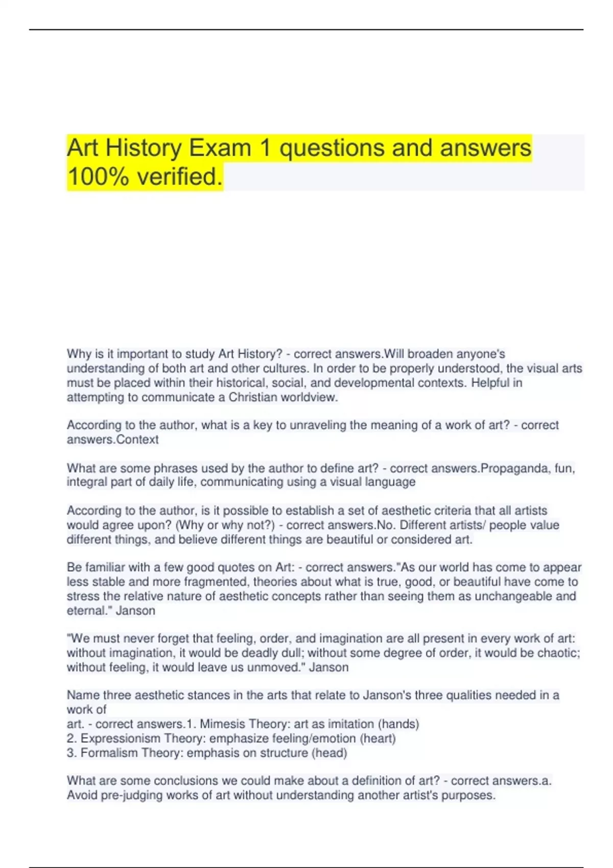 Art History Exam 1 questions and answers 100% verified. Why is it important to study Art History? - correct answers.Will broaden anyone's understanding of both art and other cultures. In order to be properly understood, the visual arts must be placed within their historical, social, and developmental contexts. Helpful in attempting to communicate a Christian worldview. According to the author, what is a key to unraveling the meaning of a work of art? - correct answers.Context What are some phrases used by the author to define art? - correct answers.Propaganda, fun, integral part of daily life, communicating using a visual language According to the author, is it possible to establish a set of aesthetic criteria that all artists would agree upon? (Why or why not?) - correct answers.No. Different artists/ people value different things, and believe different things are beautiful or considered art. Be familiar with a few good quotes on Art: - correct answers."As our world has come to appear less stable and more fragmented, theories about what is true, good, or beautiful have come to stress the relative nature of aesthetic concepts rather than seeing them as unchangeable and eternal." Janson "We must never forget that feeling, order, and imagination are all present in every work of art: without imagination, it would be deadly dull; without some degree of order, it would be chaotic; without feeling, it would leave us unmoved." Janson Name three aesthetic stances in the arts that relate to Janson's three qualities needed in a work of art. - correct answers.1. Mimesis Theory: art as imitation (hands) 2. Expressionism Theory: emphasize feeling/emotion (heart) 3. Formalism Theory: emphasis on structure (head) What are some conclusions we could make about a definition of art? - correct answers.a. Avoid pre-judging works of art without understanding another artist's purposes. b. All works cannot be judged by the same evaluation criteria. c. Feeling, imagination, and order should be key ingredients to the creation of a work of art. d. art must include the use of the heart, hands, and head Chapter 1 - correct answers.Prehistoric Art When and where was Prehistoric art first discovered by modern man? - correct answers.In 1878 in a cave Altamira (in Santilla del Mar), in Spain by Maria De Sautuola According to Janson, when did man first begin to create works of art (period and date)? - correct answers.40,000 B.C. (Upper Paleolithic) Historians divide the broad span of Prehistory into 3 major periods. Name them. - correct answers.1. Paleolithic Stone Age (Old): 2mil - 10,000 BC 2. Mesolithic Stone Age (Middle): 10,000 - 8,000 BC 3. Neolithic Stone Age (New): 8,000 - 2,000 BC According to historians, what is the earliest date assigned to Prehistoric cave paintings (what cave)? - correct answers.30,000 BC, Chauvet Cave, France Name at least three suggested purposes for cave paintings - correct answers.More than decoration, magico religious: power over animal, success in hunting, stimulate fertility/food supply Describe the process and type of materials cave artists used when creating cave paintings. - correct answers.Illuminated with oil lamps, scaffolds to reach top ceilings/walls, surfaced prepped by scraping Limestone, images engraved with sharp flint, outlined with charcoal or charred bones, various minerals from nature: powder pigments, powders mixed with binders: cave water, saliva, egg whites, animal fat, interior painted, "home made brushes" - feathers, chewed sticks, moss/fur, mineral powders blown through hollow tubes (primitive airbrush) Compare the Lascaux, Altamira, and Chauvet Prehistoric Caves by identifying a couple of "claims to fame" for each cave. - correct answers.Lascaux: most famous Paleolithic cave paintings, carbon dioxide damaged the paintings, 1983: Replica, Lascaux II, "Sistine Chapel" of Prehistoric art Altamira: first place that cave paintings were discovered in 1878, little girl Maria De Sautuola, Santillana, Spain, (paintings from 13,000 BC) Chauvet: 1994, prehistoric paintings to 30,000 BC, greatest variety of animals in black and red outlines (427 animals, 17 species), controversy: animals seem more sophisticated Explain two possible reasons (purposes) for the construction of the Stonehenge. - correct answers.Calendar Theory, Healing/Pilgrimage Site What is a lintel? - correct answers.POST-AND-LINTEL CONSTRUCTION A space-spanning technique in which two or more vertical beams (posts) support a horizontal beam (lintel). What is a megalith? - correct stone used to construct a structure or monument What is a mortise and tenon joint? - correct answers.MORTISE AND TENON JOINT A joining technique used primarily in stonemasonry and carpentry, where a projection (the tenon) on one piece of stone or board is inserted into a hole (the mortise) in a second piece. Chapter 2 - correct answers.Ancient Near Eastern Art