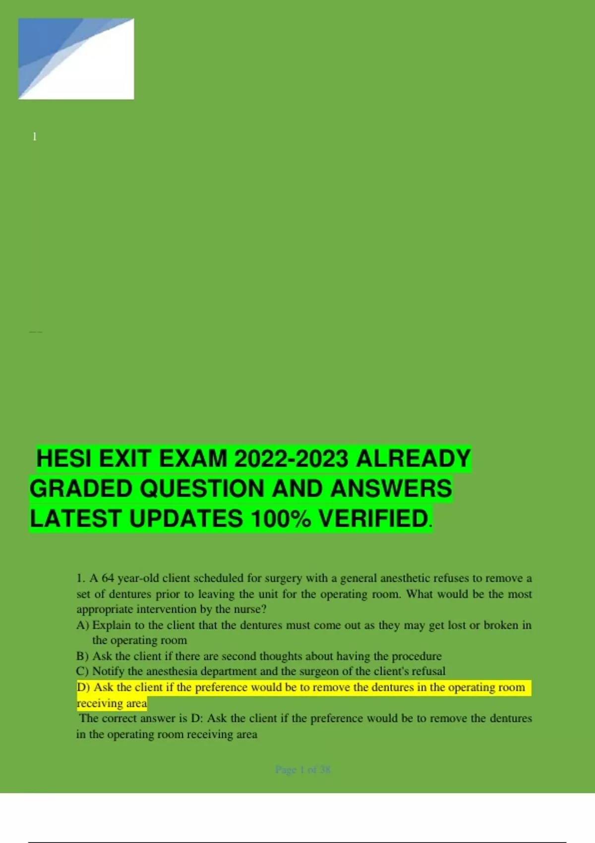 UPDATED HESI EXIT EXAM 2023-24 ALREADY GRADED QUESTION AND ANSWERS LATEST UPDATES 100% VERIFIED