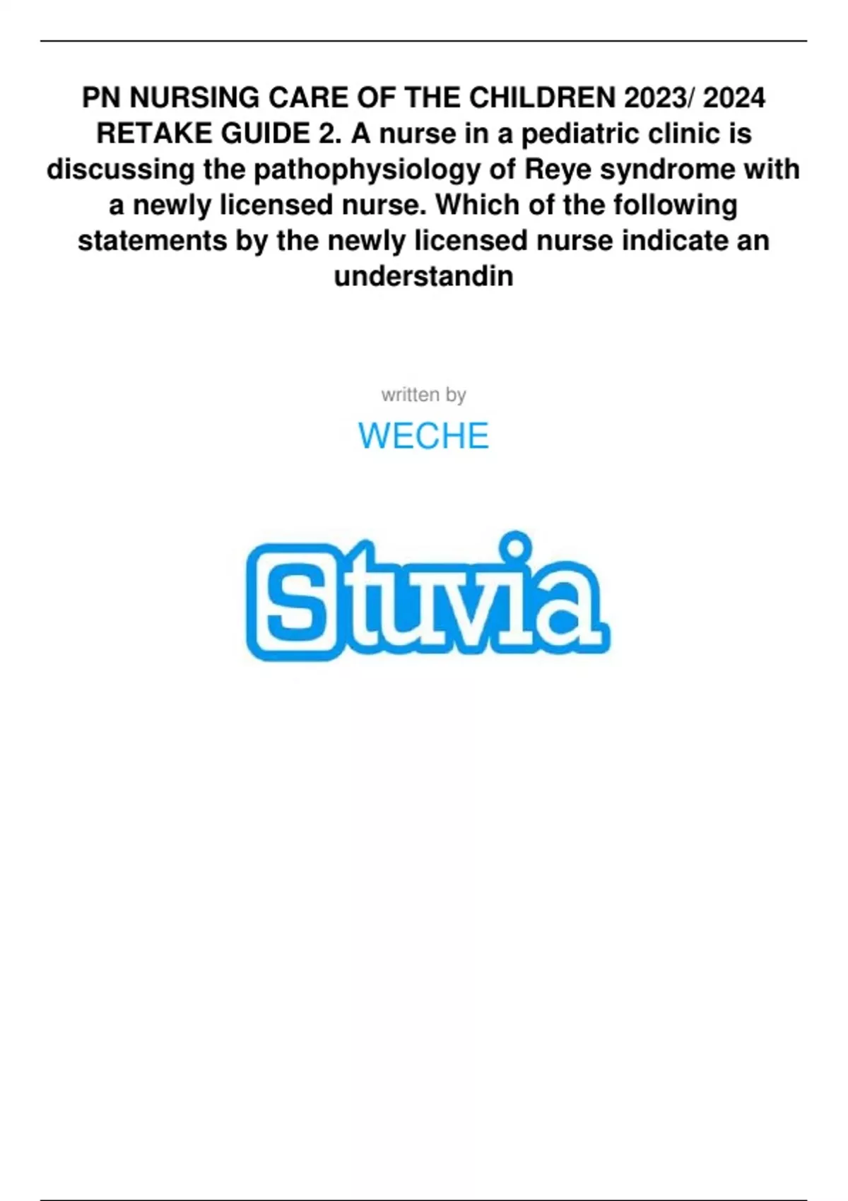 PN NURSING CARE OF THE CHILDREN RETAKE GUIDE 2. A nurse in a pediatric clinic is discussing the pathophysiology of Reye syndrome with a newly licensed nurse. Which of the following statements by the newly licensed nurse indicate an understanding