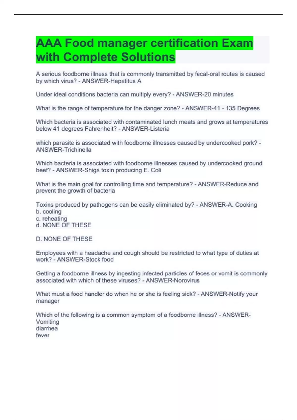 Food Manager Exam Package Deal -Solved