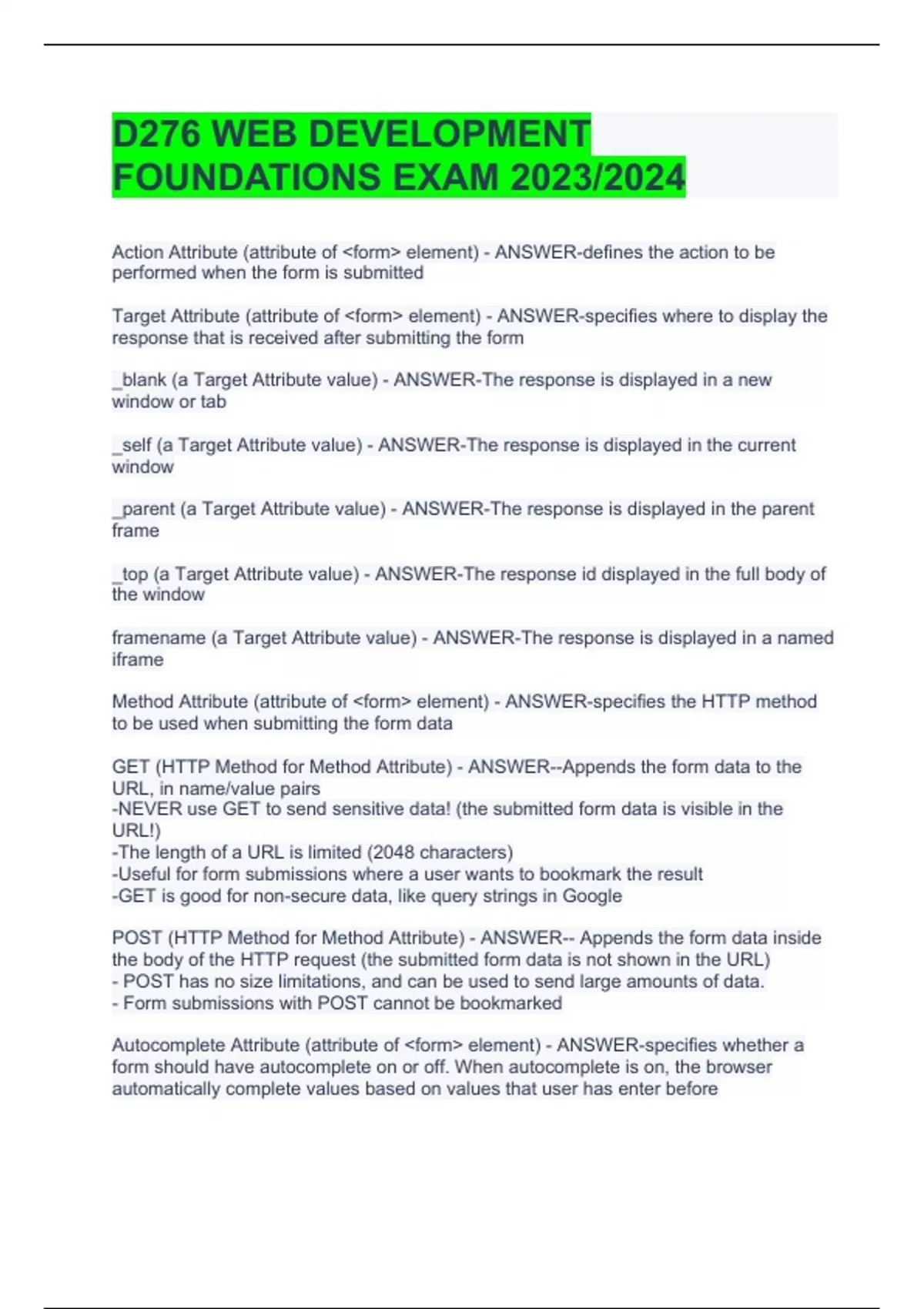 D276 WEB DEVELOPMENT FOUNDATIONS EXAM 2023/2024