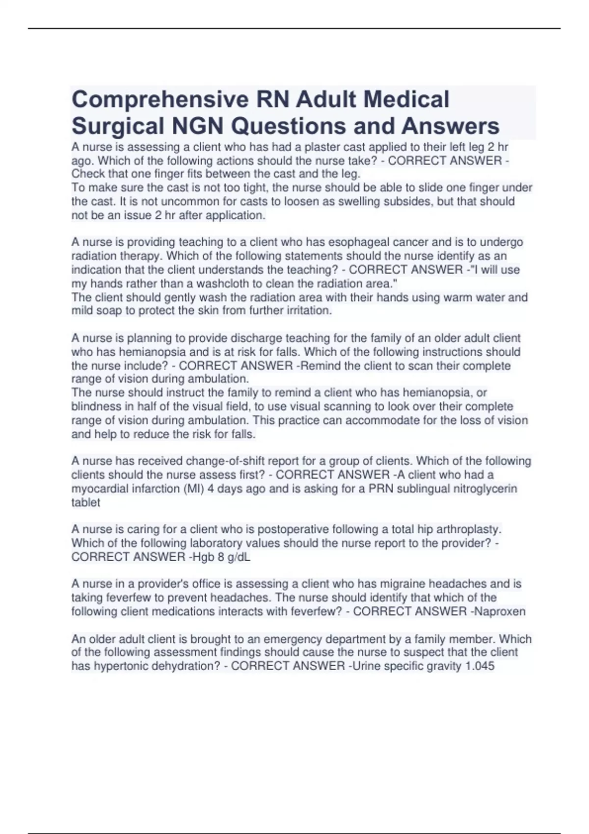 Comprehensive RN Adult Medical Surgical NGN Questions and Answers A nurse is assessing a client who has had a plaster cast applied to their left leg 2 hr ago. Which of the following actions should the nurse take? - CORRECT ANSWER - Check that one finger fits between the cast and the leg. To make sure the cast is not too tight, the nurse should be able to slide one finger under the cast. It is not uncommon for casts to loosen as swelling subsides, but that should not be an issue 2 hr after application. A nurse is providing teaching to a client who has esophageal cancer and is to undergo radiation therapy. Which of the following statements should the nurse identify as an indication that the client understands the teaching? - CORRECT ANSWER -"I will use my hands rather than a washcloth to clean the radiation area." The client should gently wash the radiation area with their hands using warm water and mild soap to protect the skin from further irritation. A nurse is planning to provide discharge teaching for the family of an older adult client who has hemianopsia and is at risk for falls. Which of the following instructions should the nurse include? - CORRECT ANSWER -Remind the client to scan their complete range of vision during ambulation. The nurse should instruct the family to remind a client who has hemianopsia, or blindness in half of the visual field, to use visual scanning to look over their complete range of vision during ambulation. This practice can accommodate for the loss of vision and help to reduce the risk for falls. A nurse has received change-of-shift report for a group of clients. Which of the following clients should the nurse assess first? - CORRECT ANSWER -A client who had a myocardial infarction (MI) 4 days ago and is asking for a PRN sublingual nitroglycerin tablet A nurse is caring for a client who is postoperative following a total hip arthroplasty. Which of the following laboratory values should the nurse report to the provider? - CORRECT ANSWER -Hgb 8 g/dL A nurse in a provider's office is assessing a client who has migraine headaches and is taking feverfew to prevent headaches. The nurse should identify that which of the following client medications interacts with feverfew? - CORRECT ANSWER -Naproxen An older adult client is brought to an emergency department by a family member. Which of the following assessment findings should cause the nurse to suspect that the client has hypertonic dehydration? - CORRECT ANSWER -Urine specific gravity 1.045