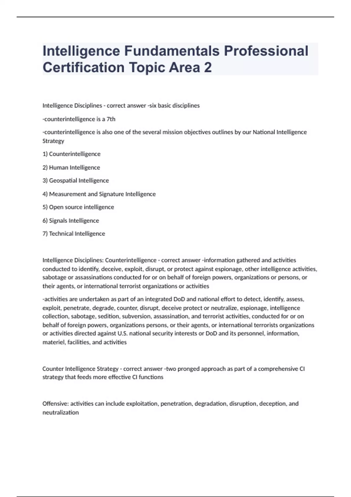 Intelligence Fundamentals Professional Certification Topic Area 2Intelligence Disciplines - correct answer -six basic disciplines -counterintelligence is a 7th -counterintelligence is also one of the several mission objectives outlines by our National Intelligence Strategy 1) Counterintelligence 2) Human Intelligence 3) Geospatial Intelligence 4) Measurement and Signature Intelligence 5) Open source intelligence 6) Signals Intelligence 7) Technical Intelligence Intelligence Disciplines: Counterintelligence - correct answer -information gathered and activities conducted to identify, deceive, exploit, disrupt, or protect against espionage, other intelligence activities, sabotage or assassinations conducted for or on behalf of foreign powers, organizations or persons, or their agents, or international terrorist organizations or activities -activities are undertaken as part of an integrated DoD and national effort to detect, identify, assess, exploit, penetrate, degrade, counter, disrupt, deceive protect or neutralize, espionage, intelligence collection, sabotage, sedition, subversion, assassination, and terrorist activities, conducted for or on behalf of foreign powers, organizations persons, or their agents, or international terrorists organizations or activities directed against U.S. national security interests or DoD and its personnel, information, materiel, facilities, and activities Counter Intelligence Strategy - correct answer -two pronged approach as part of a comprehensive CI strategy that feeds more effective CI functions Offensive: activities can include exploitation, penetration, degradation, disruption, deception, and neutralization Defensive: activities can include detection, identification, and assessment, protection and other countering activities Counterintelligence Activity Functions - correct answer counterintelligence activities encompass five functions: 1) collection 2) analysis 3) production of intelligence 4) investigation; which include the detection, identification, exploitation, and/or neutralization of adversary intelligence threats directed against the US 5) Functional Services- activities that support other intelligence or DoD operations by providing specialized defensive CI services such as red teaming, or threat vulnerability assessments also known as TVAs. -CI Activities are undertaken to support the 4 CI missions Counterintelligence Missions - correct answer 1) Countering Espionage 2) Support to Force Protection 3) Support to Critical Infrastructure Program 4) Analytic and Operational Support Counterintelligence Missions: Countering Espionage - correct answer -countering espionage, international terrorism, and the CI insider threat -tie into counterintelligence investigations using both offensive and defensive activities Counterintelligence Missions: Support to Force Protection - correct answer -includes performing functional services primarily in a defensive posture and in direct support to operations and military units performing operations Counterintelligence Missions: Support to Critical Infrastructure - correct answer -includes systems and assets, whether physical or virtual, so vital to the United States that the incapacity or destruction of such