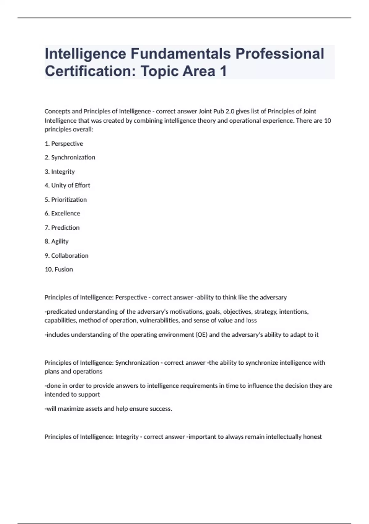 Intelligence Fundamentals Professional Certification Topic Area 1 Concepts and Principles of Intelligence - correct answer Joint Pub 2.0 gives list of Principles of Joint Intelligence that was created by combining intelligence theory and operational experience. There are 10 principles overall: 1. Perspective 2. Synchronization 3. Integrity 4. Unity of Effort 5. Prioritization 6. Excellence 7. Prediction 8. Agility 9. Collaboration 10. Fusion Principles of Intelligence: Perspective - correct answer -ability to think like the adversary -predicated understanding of the adversary's motivations, goals, objectives, strategy, intentions, capabilities, method of operation, vulnerabilities, and sense of value and loss -includes understanding of the operating environment (OE) and the adversary's ability to adapt to it Principles of Intelligence: Synchronization - correct answer -the ability to synchronize intelligence with plans and operations -done in order to provide answers to intelligence requirements in time to influence the decision they are intended to support -will maximize assets and help ensure success. Principles of Intelligence: Integrity - correct answer -important to always remain intellectually honest -hallmark of intelligence profession -intelligence concerning a situation is one of the factors in determining policy, but policy does not determine intelligence Principles of Intelligence: Unity of Effort - correct answer -cooperate to achieve a common objective -requires intelligence operations, functions, and systems that are coordinated, synchronized, integrated, and interoperable Principles of Intelligence: Prioritization - correct answer -based upon commander's requirements -offers a mechanism for addressing requirements and effectively managing risk by identifying the most important tasks and applying available resources against those tasks Principles of Intelligence: Excellence - correct answer To achieve the highest standards of excellence, intelligence products must be: -anticipatory -timely -accurate -usable -complete -relevant -objective -available Principles of Intelligence: Prediction - correct answer -accepting risk of predicting the adversary's intentions -predictive analysis goes beyond the identification of capabilities by forecasting enemy intentions and is both difficult and risky Principles of Intelligence: Agility - correct answer -remain flexible and adapt to changing situations -intelligence structures, methodologies, databases, products, and personnel should be sufficiently agile and flexible to meet changing operational situations, needs, priorities, and opportunities.