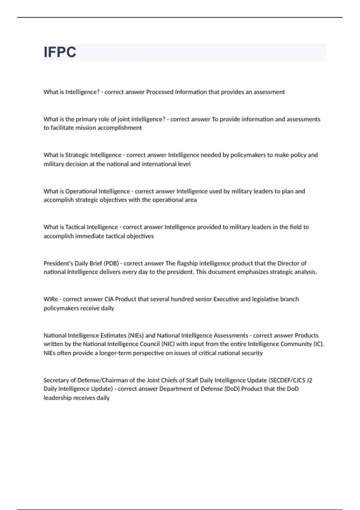 IFPC What is Intelligence? - correct answer Processed Information that provides an assessment What is the primary role of joint intelligence? - correct answer To provide information and assessments to facilitate mission accomplishment What is Strategic Intelligence - correct answer Intelligence needed by policymakers to make policy and military decision at the national and international level What is Operational Intelligence - correct answer Intelligence used by military leaders to plan and accomplish strategic objectives with the operational area What is Tactical Intelligence - correct answer Intelligence provided to military leaders in the field to accomplish immediate tactical objectives President's Daily Brief (PDB) - correct answer The flagship intelligence product that the Director of national Intelligence delivers every day to the president. This document emphasizes strategic analysis. WIRe - correct answer CIA Product that several hundred senior Executive and legislative branch policymakers receive daily National Intelligence Estimates (NIEs) and National Intelligence Assessments - correct answer Products written by the National Intelligence Council (NIC) with input from the entire Intelligence Community (IC). NIEs often provide a longer-term perspective on issues of critical national security Secretary of Defense/Chairman of the Joint Chiefs of Staff Daily Intelligence Update (SECDEF/CJCS J2 Daily Intelligence Update) - correct answer Department of Defense (DoD) Product that the DoD leadership receives daily Secretary's Morning Summary (SMS) - correct answer A State Department product that the Secretary of State Receives Daily Strategic Intelligence Target Audience - correct answer SR Military and Civilian Leaders; Combatant Commanders Responsibilities of Strategic Intelligence - correct answer Assist in developing national strategy and policy ; monitor the international or global situation ; assist in developing military plans ; assist in determining major weapons systems and force structure requirements ; support the conduct of strategic operations Operational Intelligence Target Audience - correct answer Combatant and Subordinate Joint Force Commanders; Component Commanders Responsibilities of Operational Intelligence - correct answer Focus on military capabilities and intentions of enemies and adversaries; analyze the operational environment; identify adversary centers of gravity and critical vulnerabilities; monitor events in the joint forces commanders area of interest; support the planning and conduct of joint campaigns Tactical Intelligence Target Audience - correct answer Unit Commanders Responsibilities of Tactical Intelligence - correct answer Support planning and the execution of battles, engagements, and other joint force activities; provide commanders with information on imminent threats to their forces and changes in the operational environment; provide commanders with obstacle intelligence Signals Intelligence (SIGINT) - correct answer Intelligence that involves the interception of Communications Intelligence (COMINT) and Electronic Signals Intelligence (ELINT) Communications Intelligence (COMINT) - correct answer Intelligence based on information intercepted from messages between individuals Electronic Signals Intelligence (ELINT) - correct answer Refers to the information gleaned from analyzing electronic signals, such as radars