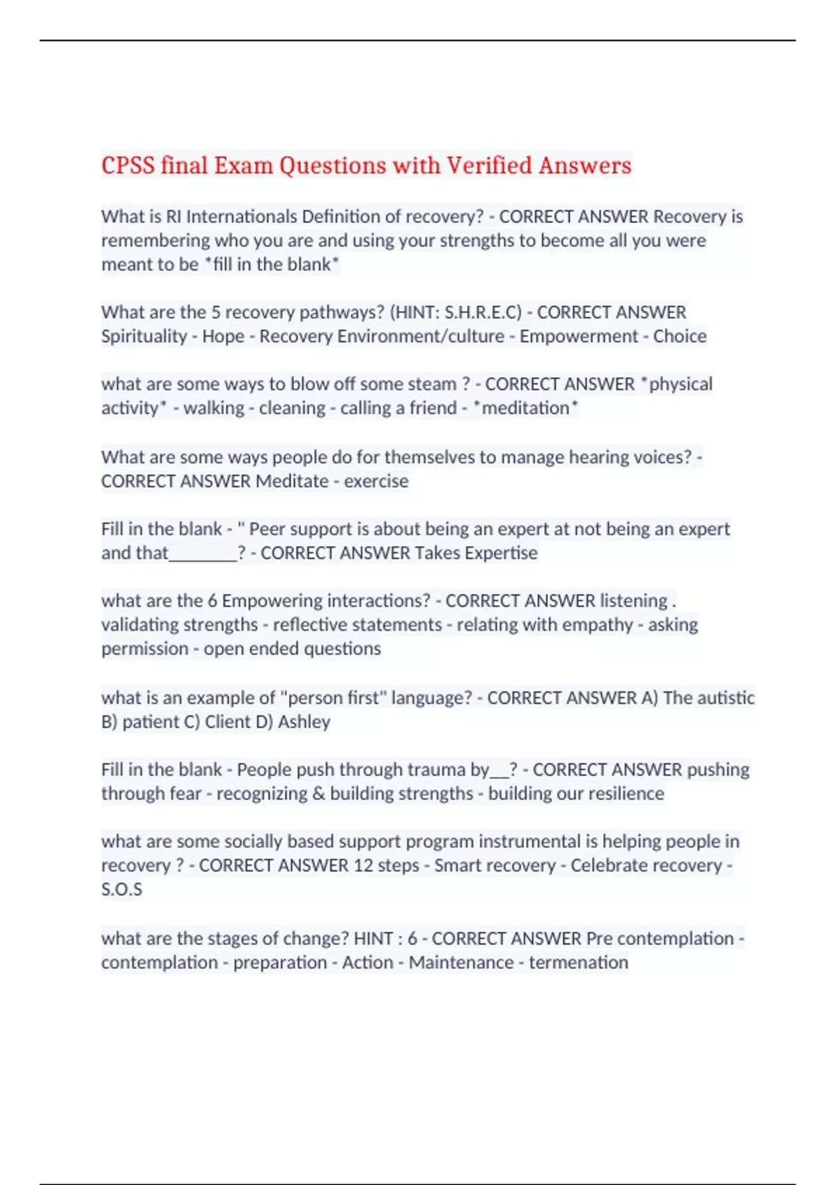 CPSS final Exam Questions with Verified Answers What is RI Internationals Definition of recovery? - CORRECT ANSWER Recovery is remembering who you are and using your strengths to become all you were meant to be *fill in the blank* What are the 5 recovery pathways? (HINT: S.H.R.E.C) - CORRECT ANSWER Spirituality - Hope - Recovery Environment/culture - Empowerment - Choice what are some ways to blow off some steam ? - CORRECT ANSWER *physical activity* - walking - cleaning - calling a friend - *meditation* What are some ways people do for themselves to manage hearing voices? - CORRECT ANSWER Meditate - exercise Fill in the blank - " Peer support is about being an expert at not being an expert and that_______? - CORRECT ANSWER Takes Expertise what are the 6 Empowering interactions? - CORRECT ANSWER listening . validating strengths - reflective statements - relating with empathy - asking permission - open ended questions what is an example of "person first" language? - CORRECT ANSWER A) The autistic B) patient C) Client D) Ashley Fill in the blank - People push through trauma by__? - CORRECT ANSWER pushing through fear - recognizing & building strengths - building our resilience what are some socially based support program instrumental is helping people in recovery ? - CORRECT ANSWER 12 steps - Smart recovery - Celebrate recovery - S.O.S what are the stages of change? HINT : 6 - CORRECT ANSWER Pre contemplation - contemplation - preparation - Action - Maintenance - termenation fill in the blank - The fear will never go away as long as you continue to ____? - CORRECT ANSWER Grow name some coping skills a person can use to manage hearing voices? - CORRECT ANSWER Change of environment - reality check - music with headphones Fill in the blank - Work toward establishing ___________ that serve the persons needs & preferences. - CORRECT ANSWER mutually empowered relationships What do you do if a relative or friend asks you about information on the person you are providing services to? - CORRECT ANSWER I cannot confirm or deny without an ROI (release of info)