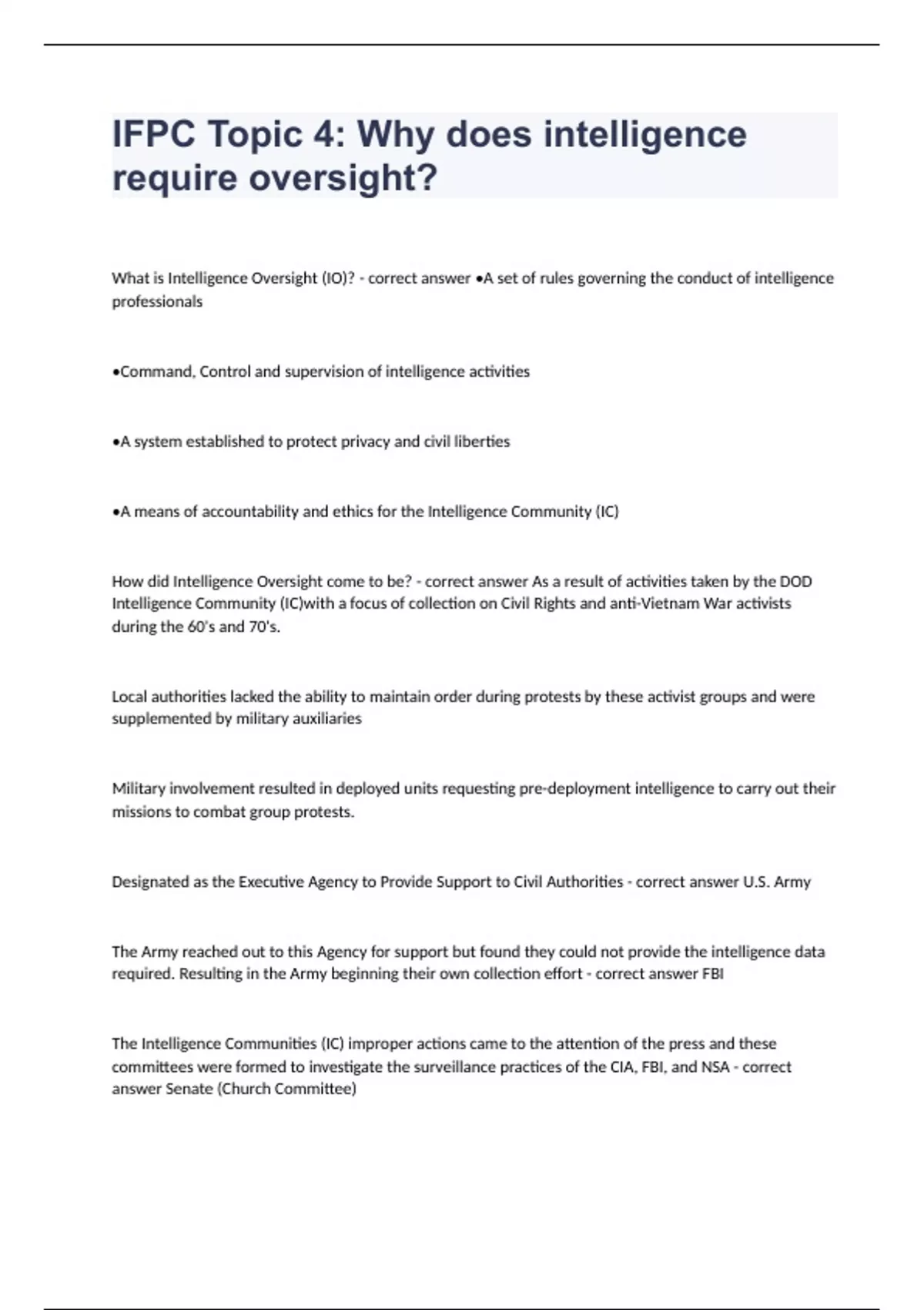 IFPC Topic 4 Why does intelligence require oversightWhat is Intelligence Oversight (IO)? - correct answer •A set of rules governing the conduct of intelligence professionals •Command, Control and supervision of intelligence activities •A system established to protect privacy and civil liberties •A means of accountability and ethics for the Intelligence Community (IC) How did Intelligence Oversight come to be? - correct answer As a result of activities taken by the DOD Intelligence Community (IC)with a focus of collection on Civil Rights and anti-Vietnam War activists during the 60's and 70's. Local authorities lacked the ability to maintain order during protests by these activist groups and were supplemented by military auxiliaries Military involvement resulted in deployed units requesting pre-deployment intelligence to carry out their missions to combat group protests. Designated as the Executive Agency to Provide Support to Civil Authorities - correct answer U.S. Army The Army reached out to this Agency for support but found they could not provide the intelligence data required. Resulting in the Army beginning their own collection effort - correct answer FBI The Intelligence Communities (IC) improper actions came to the attention of the press and these committees were formed to investigate the surveillance practices of the CIA, FBI, and NSA - correct answer Senate (Church Committee) House (Pike Committee) Examples of oversteps made by the CIA, FBI, and NSA - correct answer Creating watchlists for US Politicians Opening Personal US Mail Carrying out Covert Assassinations of Foreign Leaders When and who issued Executive Order 11905 - correct answer President Gerald Ford on 18 February 1976 Four changes to the Intelligence Community created by Executive Order 11905 - correct answer •Created the National Security Committee, chaired by the Director of Central Intelligence (DCI) •Established the Operations Advisory Group •Created a part-time Intelligence Oversight Board to report illegal activity to the President and Attorney General •Created the first ban on political assassination When and who issued Executive Order 12036 - correct answer President Jimmy Carter on 24 January 1978 What are the impacts did Executive Order 12036 have on the Intelligence Community? - correct answer •Created the Policy Review Committee (PRC), defining the priorities for intelligence collection and analysis •Imposed restrictions on the IC pertaining to the collection on U.S. Persons without consent of the President and Attorney General •Created the National Foreign Intelligence Board (NFIB)