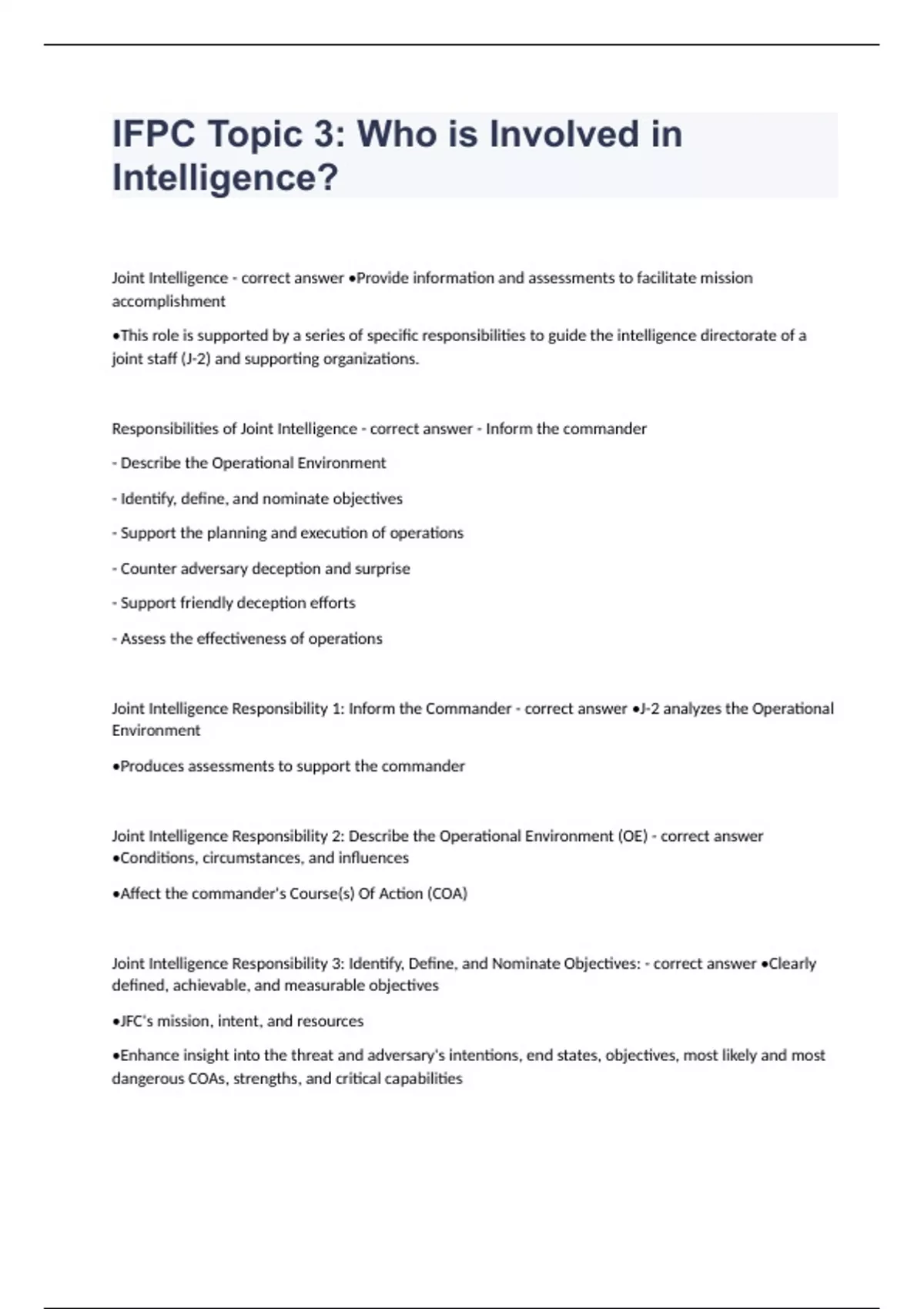IFPC Topic 3 Who is Involved in Intelligence Joint Intelligence - correct answer •Provide information and assessments to facilitate mission accomplishment •This role is supported by a series of specific responsibilities to guide the intelligence directorate of a joint staff (J-2) and supporting organizations. Responsibilities of Joint Intelligence - correct answer - Inform the commander - Describe the Operational Environment - Identify, define, and nominate objectives - Support the planning and execution of operations - Counter adversary deception and surprise - Support friendly deception efforts - Assess the effectiveness of operations Joint Intelligence Responsibility 1: Inform the Commander - correct answer •J-2 analyzes the Operational Environment •Produces assessments to support the commander Joint Intelligence Responsibility 2: Describe the Operational Environment (OE) - correct answer •Conditions, circumstances, and influences •Affect the commander's Course(s) Of Action (COA) Joint Intelligence Responsibility 3: Identify, Define, and Nominate Objectives: - correct answer •Clearly defined, achievable, and measurable objectives •JFC's mission, intent, and resources •Enhance insight into the threat and adversary's intentions, end states, objectives, most likely and most dangerous COAs, strengths, and critical capabilities •J-2 recommends objectives, requirements, and centers of gravity (COGs) Joint Intelligence Responsibility 4: Support the Planning and Execution of Operations - correct answer •Intelligence used to plan, direct, conduct, and assess operations •Identifying and selecting specific objectives and targets •How to accomplish the JFC's overall mission •J-2 supports the execution of the plan with the strategic, operational, and tactical intelligence Joint Intelligence Responsibility 5: Counter Adversary Deception and Surprise - correct answer •Consider all possible adversary capabilities and intentions •Look for anomalies •Analysts must verify their analysis Joint Intelligence Responsibility 6: Support Friendly Deception Efforts - correct answer •Confusing or deceiving the adversary helps achieve security and surprise the enemy •Intelligence and counterintelligence (CI) support friendly information operations (IO) •J-2 assesses how the adversary reacts to friendly deception efforts •Use a red team or red cell Joint Intelligence Responsibility 7: - correct answer •Evaluate military operations by objectively assessing their impact on the adversary •Producing desired or undesired effects •Adapt plans to respond to enemy actions Intelligence Directorate of a Joint Staff (J2) - correct answer Provides the Commander with threat assessments and warnings and helps him plan missions accordingly. He/She coordinates, guides, and synchronizes intelligence with ongoing planning and integrates all of this with all American and coalition forces. Responsibilities of Intelligence Directorate of a Joint Staff (J2) - correct answer 1. Provide Threat Assessment and Warning 2. Participate in all decision making and planning 3. Synchronize intelligence with operations and plans 4. Formulate concept of intelligence operations 5. Develop detailed intelligence annexes 6. Integrate joint and national intelligence support 7. Exploit combat reporting from operational forces 8. Organize for continuous operations 9. Ensure Accessibility of Intelligence 10. Establish a joint intelligence architecture J2 Responsibility 1: Provide Threat Assessments and Warning - correct answer •Analyze all aspects of the OE and enemy capabilities and intentions •Provide threat analysis to the joint force and its components J2 Responsibility 2: Participate in all Decision Making and Planning - correct answer •Participates in the JFC's decision-making and planning processes from inception until the completion of the operation •JFC and J-2 continuously discuss the adversary's relative strengths, weaknesses, and ability to prevent the joint force from accomplishing its mission J2 Responsibility 3: Synchronize Intelligence With Operations and Plans - correct answer •Coordinate with groups to ensure that intelligence activities are synchronized to support the commander's decision-making process •Target intelligence provides link between intelligence and operations •Commanders' desired effects provide the basis for target development, nomination, and prioritization •Assessment will inform any changes in the commander's objective and strategy J2 Responsibility 4: Formulate Concept of Intelligence Operations - correct answer •Develop and disseminate a concept of intelligence operations: tasking, reporting responsibilities, and required coordination J2 Responsibility 5: Develop Detailed Intelligence Annexes - correct answer •JFC's Priority Intelligence Requirements (PIRs) and the results of wargaming serve as the basis for the intelligence annex of each directed Operations Plan (OPLAN) and concept plan