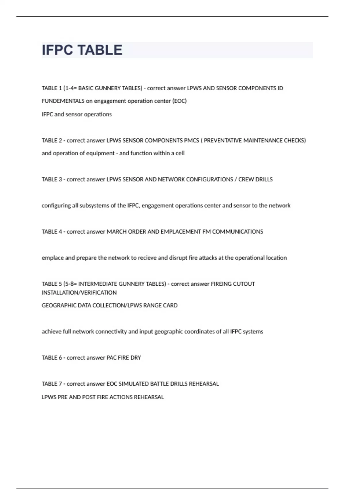 IFPC TABLETABLE 1 (1-4= BASIC GUNNERY TABLES) - correct answer LPWS AND SENSOR COMPONENTS ID FUNDEMENTALS on engagement operation center (EOC) IFPC and sensor operations TABLE 2 - correct answer LPWS SENSOR COMPONENTS PMCS ( PREVENTATIVE MAINTENANCE CHECKS) and operation of equipment - and function within a cell TABLE 3 - correct answer LPWS SENSOR AND NETWORK CONFIGURATIONS / CREW DRILLS configuring all subsystems of the IFPC, engagement operations center and sensor to the network TABLE 4 - correct answer MARCH ORDER AND EMPLACEMENT FM COMMUNICATIONS emplace and prepare the network to recieve and disrupt fire attacks at the operational location TABLE 5 (5-8= INTERMEDIATE GUNNERY TABLES) - correct answer FIREING CUTOUT INSTALLATION/VERIFICATION GEOGRAPHIC DATA COLLECTION/LPWS RANGE CARD achieve full network connectivity and input geographic coordinates of all IFPC systems TABLE 6 - correct answer PAC FIRE DRY TABLE 7 - correct answer EOC SIMULATED BATTLE DRILLS REHEARSAL LPWS PRE AND POST FIRE ACTIONS REHEARSAL EXECUTE SIMULATED BATTLE DRILL TABLE 8 - correct answer SIMULATED BATTLE DRILLS QUAL - LPWS PRE AND POST FIRE ACTIONS QUAL test the sections ability to execute simulated battle drills for certifications TABLE 9 (9-12= ADVANCED GUNNERY TABLE) - correct answer IFPC MOBILITY EXERCISE - LEADERS TASKS ORDERS PRODUCTIONS, PCC, PCI AND RSOP Reconnaissance, Selection and Occupation of Position. test the proficiency of the platoon while executing preliminary planning and rsop TABLE 10 - correct answer IFPC MOBILITY EXERCISE EXECUSION test the ability of the platoon during march order movement and emplacement TABLE 11 - correct answer PAC FIRE LIVE TABLE 12 - correct answer LIVE FIRE EXERCISE
