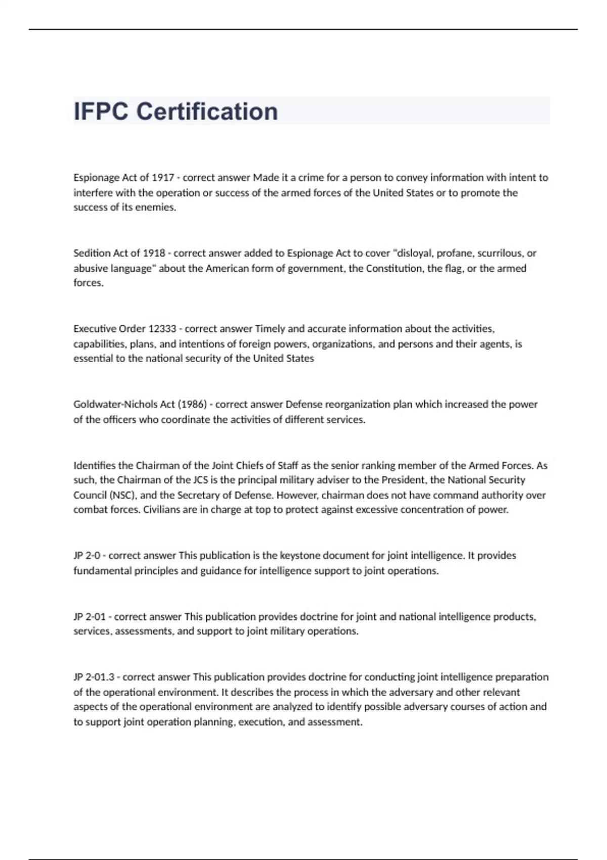IFPC CertificationEspionage Act of 1917 - correct answer Made it a crime for a person to convey information with intent to interfere with the operation or success of the armed forces of the United States or to promote the success of its enemies. Sedition Act of 1918 - correct answer added to Espionage Act to cover "disloyal, profane, scurrilous, or abusive language" about the American form of government, the Constitution, the flag, or the armed forces. Executive Order 12333 - correct answer Timely and accurate information about the activities, capabilities, plans, and intentions of foreign powers, organizations, and persons and their agents, is essential to the national security of the United States Goldwater-Nichols Act (1986) - correct answer Defense reorganization plan which increased the power of the officers who coordinate the activities of different services. Identifies the Chairman of the Joint Chiefs of Staff as the senior ranking member of the Armed Forces. As such, the Chairman of the JCS is the principal military adviser to the President, the National Security Council (NSC), and the Secretary of Defense. However, chairman does not have command authority over combat forces. Civilians are in charge at top to protect against excessive concentration of power. JP 2-0 - correct answer This publication is the keystone document for joint intelligence. It provides fundamental principles and guidance for intelligence support to joint operations. JP 2-01 - correct answer This publication provides doctrine for joint and national intelligence products, services, assessments, and support to joint military operations. JP 2-01.3 - correct answer This publication provides doctrine for conducting joint intelligence preparation of the operational environment. It describes the process in which the adversary and other relevant aspects of the operational environment are analyzed to identify possible adversary courses of action and to support joint operation planning, execution, and assessment. JP 2-03 - correct answer This publication provides doctrine for conducting geospatial intelligence (GEOINT) across the range of military operations. 2014 National Intelligence Strategy (NIS) - correct answer Provides the IC with the mission direction of the Director of National Intelligence (DNI) for the next four to five years. National Security Act (1947) - correct answer Created the Department of Defense (DoD), the National Security Council (NSC) and the Central Intelligence Agency (CIA). Counterintelligence (CI) - correct answer Counterintelligence is information gathered and activities conducted to protect against espionage, other intelligence activities, sabotage, or assassinations conducted by or on behalf of foreign governments or elements of foreign organizations, persons, or international terrorist activities. Open Source Intelligence (OSINT) - correct answer intelligence that is produced from publicly available information Geospatial Intelligence (GEOINT) - correct answer imagery, imagery intelligence (IMINT), and geospatial information Human Intelligence (HUMINT) - correct answer any information that can be gathered from human sources. Signals Intelligence (SIGINT) - correct answer Information gathered from data transmissions, including communications intelligence (COMINT), electronic intelligence (ELINT), and foreign instrumentation signals intelligence (FISINT). Measurement and Signature Intelligence (MASINT) - correct answer Information produced by quantitative and qualitative analysis of physical attributes of targets and events in order to characterize and identify them. Technical Intelligence (TECHINT) - correct answer derived from the collection and analysis of threat and foreign military equipment and associated materiel.