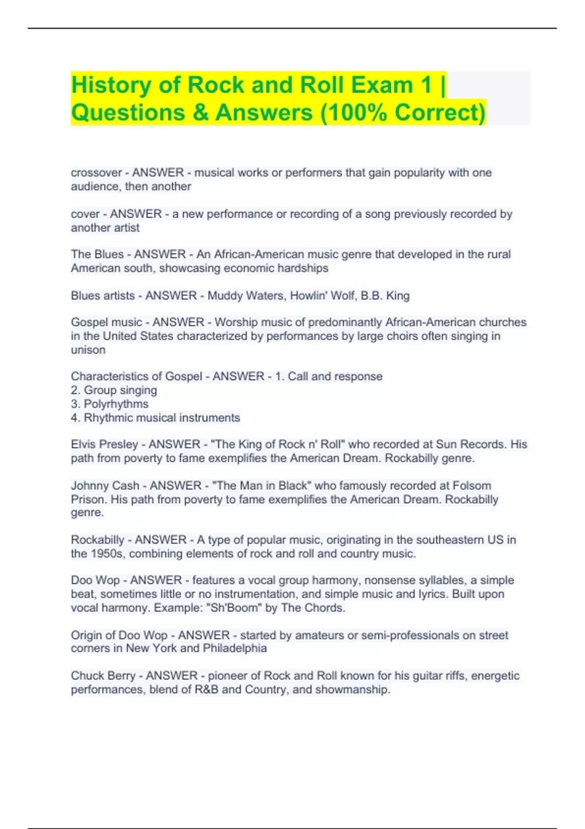 History of Rock and Roll Exam 1 | Questions & Answers (100% Correct)History of Rock and Roll Exam 1 | Questions & Answers (100% Correct)History of Rock and Roll Exam 1 | Questions & Answers (100% Correct) crossover - ANSWER - musical works or performers that gain popularity with one audience, then another cover - ANSWER - a new performance or recording of a song previously recorded by another artist The Blues - ANSWER - An African-American music genre that developed in the rural American south, showcasing economic hardships Blues artists - ANSWER - Muddy Waters, Howlin' Wolf, B.B. King Gospel music - ANSWER - Worship music of predominantly African-American churches in the United States characterized by performances by large choirs often singing in unison