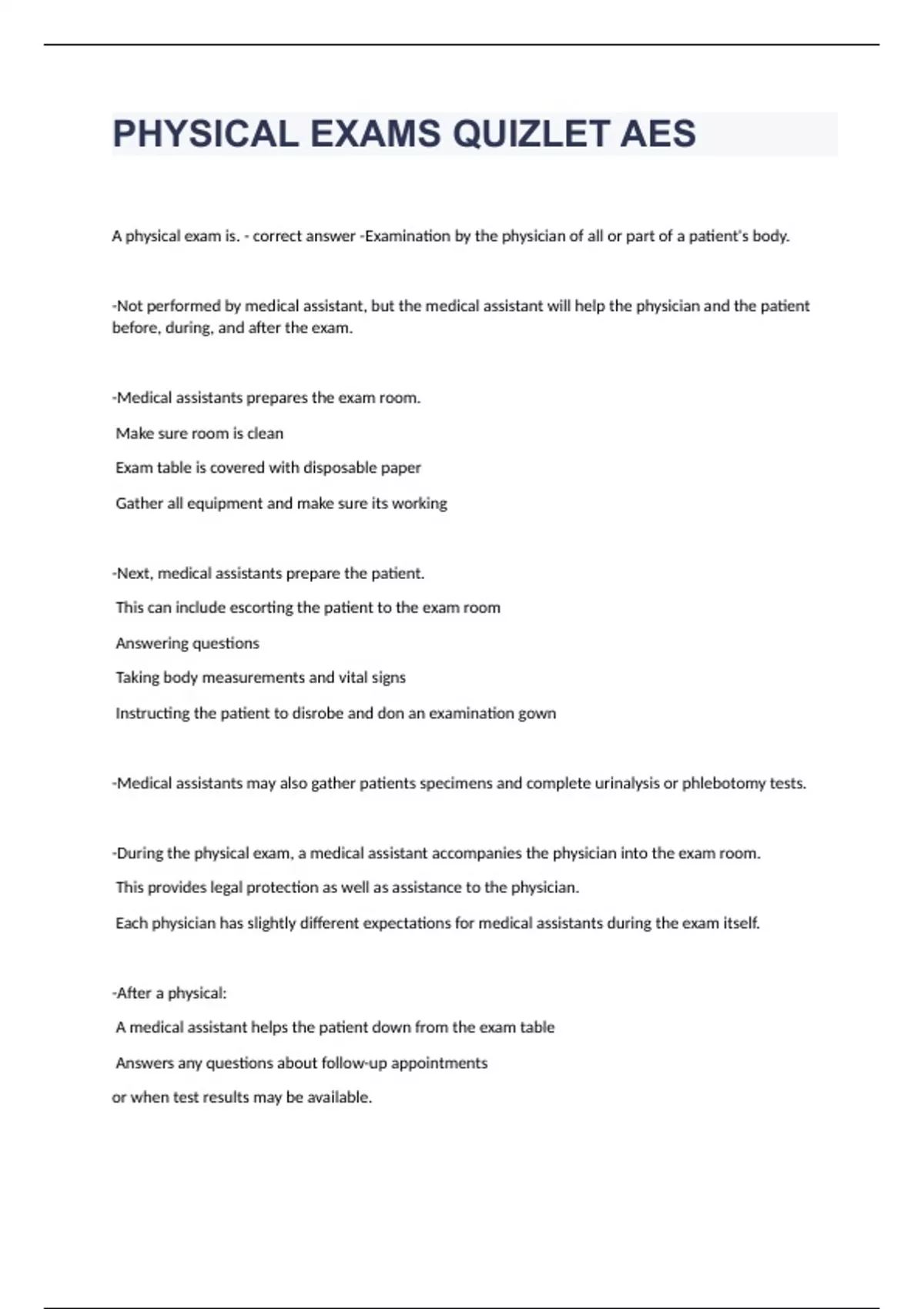 PHYSICAL EXAMS QUIZLET AESA physical exam is. - correct answer -Examination by the physician of all or part of a patient's body. -Not performed by medical assistant, but the medical assistant will help the physician and the patient before, during, and after the exam. -Medical assistants prepares the exam room. Make sure room is clean Exam table is covered with disposable paper Gather all equipment and make sure its working -Next, medical assistants prepare the patient. This can include escorting the patient to the exam room Answering questions Taking body measurements and vital signs Instructing the patient to disrobe and don an examination gown -Medical assistants may also gather patients specimens and complete urinalysis or phlebotomy tests. -During the physical exam, a medical assistant accompanies the physician into the exam room. This provides legal protection as well as assistance to the physician. Each physician has slightly different expectations for medical assistants during the exam itself. -After a physical: A medical assistant helps the patient down from the exam table Answers any questions about follow-up appointments or when test results may be available. Assistants clean up the room after the patient leaves and completes any remaining documentation in the patient's medical record. DOCUMENTATION: Medical assistants do most, if not all, of the documentation of a physical exam appointment in the patient's medical record. Be sure to use the documentation method that is approved at your facility. EENT exam - correct answer -Focuses on the eyes, ears, nose, and throat. -This exam typically includes screenings for vision and hearing problems. CPE - correct answer -AKA a complete physical exam. -Also called a general physical exam, a physical exam (PE), a history and physical (H&P), or simply a physical. -Includes a review of the entire body and all body systems. -CPEs are usually performed by a patient's primary care physician and are documented according to the problem-oriented medical record system. Well-child visit - correct answer A routine examination of a pediatric patient GYN exam - correct answer -A gynecological exam. -It is an examination of the female reproductive organs -More likely to be performed by a specialist, who may find it more appropriate to document findings in a source-oriented system.