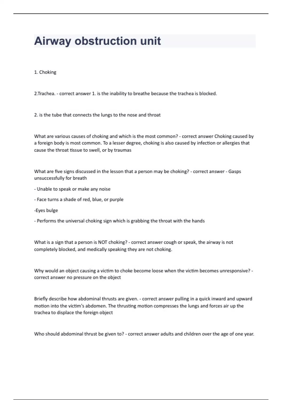 Airway obstruction unit1. Choking 2.Trachea. - correct answer 1. is the inability to breathe because the trachea is blocked. 2. is the tube that connects the lungs to the nose and throat What are various causes of choking and which is the most common? - correct answer Choking caused by a foreign body is most common. To a lesser degree, choking is also caused by infection or allergies that cause the throat tissue to swell, or by traumas What are five signs discussed in the lesson that a person may be choking? - correct answer - Gasps unsuccessfully for breath - Unable to speak or make any noise - Face turns a shade of red, blue, or purple -Eyes bulge - Performs the universal choking sign which is grabbing the throat with the hands What is a sign that a person is NOT choking? - correct answer cough or speak, the airway is not completely blocked, and medically speaking they are not choking. Why would an object causing a victim to choke become loose when the victim becomes unresponsive? - correct answer no pressure on the object Briefly describe how abdominal thrusts are given. - correct answer pulling in a quick inward and upward motion into the victim's abdomen. The thrusting motion compresses the lungs and forces air up the trachea to displace the foreign object Who should abdominal thrust be given to? - correct answer adults and children over the age of one year. When should abdominal thrusts be given? - correct answer If an adult or child is responsive while choking How can you verify an adult is choking? - correct answer victim cannot speak or cough, the victim is choking What are some cases when abdominal thrusts should not be given? - correct answer pregnant women, obese adults, or victims in a bed Briefly describe how chest thrusts are performed on an adult or child. - correct answer Wrapping the arms around the victim's chest using the same type of grip as with an abdominal thrust Briefly describe how back blows are performed on an adult or child. - correct answer Using the heel of your free hand, give a firm back blow between the victim's scapulae, or shoulder blades. If a choking victim becomes unresponsive, what procedure should you start? - correct answer shout for someone to help activate the emergency response system and retrieve an AED. Begin CPR with chest compressions. Do not check for a pulse. When performing CPR on an unresponsive victim, what should be done when giving rescue breaths? - correct answer look for the object causing the obstruction. If you see the object and it can be easily removed, then carefully remove it. NEVER perform a blind finger-sweep because it may lodge the object more deeply in the airway. How can you verify an infant is choking? - correct answer cannot cry or cough, they are choking If an infant is choking what technique should be performed first and how many? What technique should be done second and how many? - correct answer administer 5 back blows and 5 chest thrusts Describe how a back blows are performed on an infant. - correct answer 5 back blows
