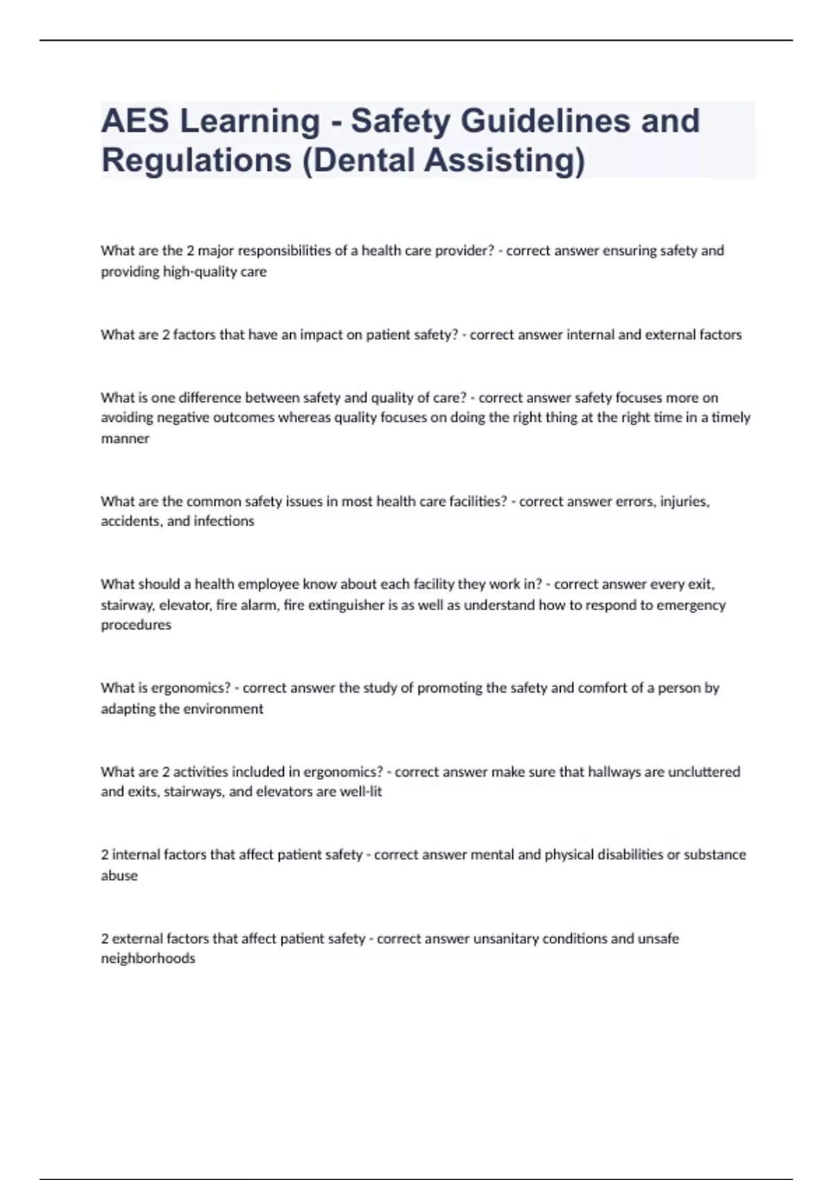 AES Learning - Safety Guidelines and Regulations (Dental Assisting) What are the 2 major responsibilities of a health care provider? - correct answer ensuring safety and providing high-quality care What are 2 factors that have an impact on patient safety? - correct answer internal and external factors What is one difference between safety and quality of care? - correct answer safety focuses more on avoiding negative outcomes whereas quality focuses on doing the right thing at the right time in a timely manner What are the common safety issues in most health care facilities? - correct answer errors, injuries, accidents, and infections What should a health employee know about each facility they work in? - correct answer every exit, stairway, elevator, fire alarm, fire extinguisher is as well as understand how to respond to emergency procedures What is ergonomics? - correct answer the study of promoting the safety and comfort of a person by adapting the environment What are 2 activities included in ergonomics? - correct answer make sure that hallways are uncluttered and exits, stairways, and elevators are well-lit 2 internal factors that affect patient safety - correct answer mental and physical disabilities or substance abuse 2 external factors that affect patient safety - correct answer unsanitary conditions and unsafe neighborhoods What type of areas should be cleaned daily? - correct answer high traffic areas and frequently used objects What are the steps to greeting a patient? - correct answer respect the patient's privacy, use their preferred name, introduce yourself, be personable, provide privacy, and validate the patient's concerns How do you demonstrate respect to a patient's privacy? - correct answer close any doors and shut any blinds to a room before discussing their case or beginning a procedure as well as requesting any family or friends to leave the room Why is properly identifying patients important? - correct answer it helps health care providers provide the best quality of care as well as protect the facility staff from making serious mistakes What are the steps to identifying a patient? - correct answer check the patient's wristband and make sure that it matches their chart, have the patient confirm their full name and date of birth as well as any scheduled procedures When should procedures be explained to patients? - correct answer after privacy is provided and before the procedure begins and is confirmed with the patient and their identity What is a regulation? - correct answer a rule made and maintained by authority What are health care agencies responsible for? - correct answer monitoring practitioners and facilities, providing information about industry changes, promote safety, ensure legal compliances and quality service Who establishes rules and regulations? - correct answer federal, state, and local regulatory agencies What is OSHA? - correct answer Occupational Safety and Health Administration (enforces safety standards in the workplace to protect employees from injury and illness)