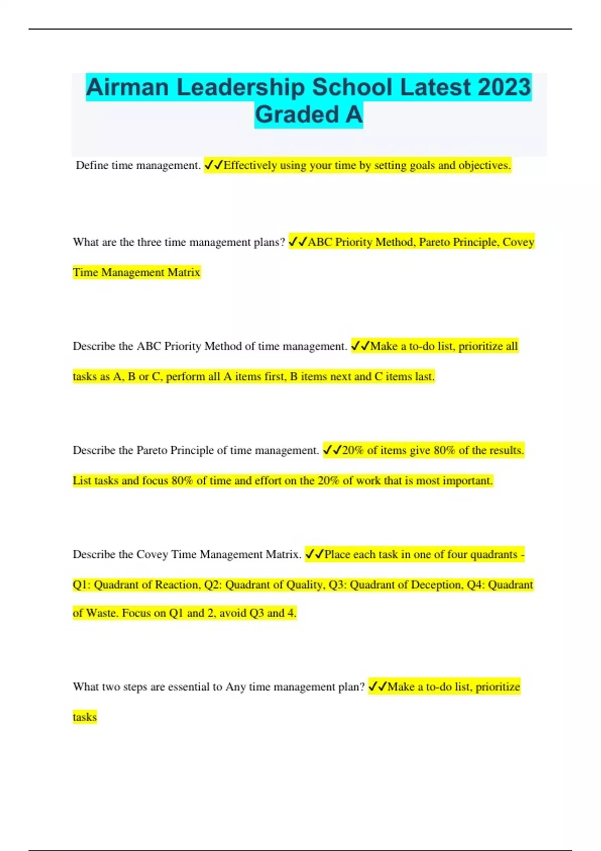 Airman Leadership School Latest 2023 Graded A Define time management. Effectively using your time by setting goals and objectives. What are the three time management plans? ABC Priority Method, Pareto Principle, Covey Time Management Matrix Describe the ABC Priority Method of time management. Make a to-do list, prioritize all tasks as A, B or C, perform all A items first, B items next and C items last. Describe the Pareto Principle of time management. 20% of items give 80% of the results. List tasks and focus 80% of time and effort on the 20% of work that is most important. Describe the Covey Time Management Matrix. Place each task in one of four quadrants - Q1: Quadrant of Reaction, Q2: Quadrant of Quality, Q3: Quadrant of Deception, Q4: Quadrant of Waste. Focus on Q1 and 2, avoid Q3 and 4. What two steps are essential to Any time management plan? Make a to-do list, prioritize tasks List several time management tools. Calendars, organizers, personal planners, PDAs, smartphones What types of items should be delegated? Priority "C" tasks, priority items that are urgent but not difficult How can you take command of the telephone? Don't depend solely on messages left, no more telephone tag, call scheduling, work with others, voice-mail and answering machines Identify 2 examples of the early use of air power. Air Machines, Aeroplane No. 1, Military ballooning Identify the 4 operations the USAF has participated in since 1990. Desert Storm, Provide Relief/ Restore Hope, Allied Force, Enduring Freedom List 2 Air Force Medal of Honor recipients. SSgt Henry Erwin, A1C William Pitsenbarger, SSgt Maynard H. Smith, TSgt Forrest Vosler, SSgt Archibald Mathies, A1C John L. Levitow, CMSgt Richard Etchberger What Air Force Manual (AFM) or Air Force Instruction (AFI) governs Dress and Appearance? AFI 36-2903 How do Dress and Appearance support Air Force culture? Provide standardization and teamwork How far back does the origin of Dress and Appearance standards date? 1775, when General George Washington commanded the Continental Army Why is it important for military members to show respect for the Flag? It honors our military heritage and shows an appreciation for freedom. What Air Force Manual (AFM) or Air Force Instruction (AFI) governs Drill and Ceremonies? AFM 36-2203 Air Force culture supports military professional by: Helping