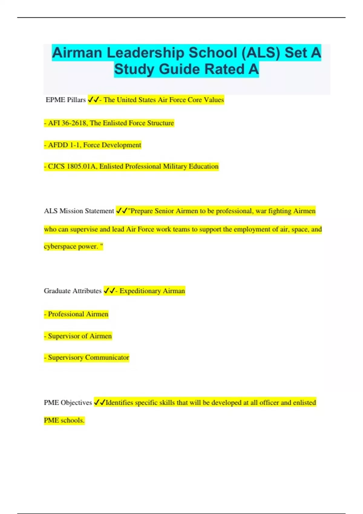Airman Leadership School (ALS) Set A Study Guide Rated A