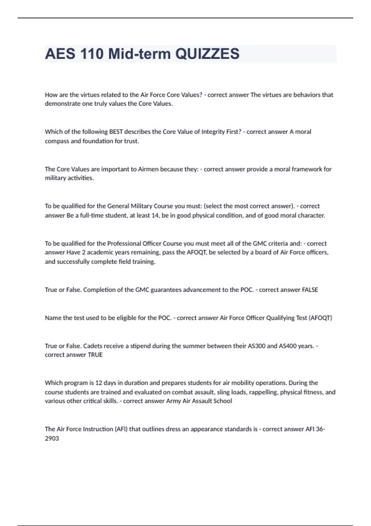 AES 110 Mid-term QUIZZESHow are the virtues related to the Air Force Core Values? - correct answer The virtues are behaviors that demonstrate one truly values the Core Values. Which of the following BEST describes the Core Value of Integrity First? - correct answer A moral compass and foundation for trust. The Core Values are important to Airmen because they: - correct answer provide a moral framework for military activities. To be qualified for the General Military Course you must: (select the most correct answer). - correct answer Be a full-time student, at least 14, be in good physical condition, and of good moral character. To be qualified for the Professional Officer Course you must meet all of the GMC criteria and: - correct answer Have 2 academic years remaining, pass the AFOQT, be selected by a board of Air Force officers, and successfully complete field training. True or False. Completion of the GMC guarantees advancement to the POC. - correct answer FALSE Name the test used to be eligible for the POC. - correct answer Air Force Officer Qualifying Test (AFOQT) True or False. Cadets receive a stipend during the summer between their AS300 and AS400 years. - correct answer TRUE Which program is 12 days in duration and prepares students for air mobility operations. During the course students are trained and evaluated on combat assault, sling loads, rappelling, physical fitness, and various other critical skills. - correct answer Army Air Assault School The Air Force Instruction (AFI) that outlines dress an appearance standards is - correct answer AFI 36-2903 All the items below are true about AFROTC classes except: - correct answer You will come to "attention" when ANY USAF or USSF member enters the room What percentage of class attendance must be met to be given a grade? - correct answer 80 What was the US Army unit, founded in 1907 that took "charge of all matters pertaining to military ballooning, air machines, and all kindred subjects", but didn't have own any airplanes yet. - correct answer Aeronautical Division of the Signal Corp The Aeronautical Division of the Signal Corp first used aircraft for a military purpose, mostly for Observation, in: - correct answer Pursuing 'Pancho' Villa back into Mexico after he attacked Columbus, New Mexico in 1916 What combatant arm of the Army provided airpower in France in World War I? - correct answer Air Service of the US Army What did Brigadier General William "Billy" Mitchell of the US Army's Air Service publicly stated airplanes could protect the United States better than the US Navy, and to prove it: - correct answer Bombed and sank the modern battleship Ostfriesland, showed how airpower can defeat sea power. The Air Corp Tactical School developed doctrine, principles and philosophy on: - correct answer High-altitude daylight, Strategic Bombing. For females, what is the minimum hair length? - correct answer No minimum length Which of the following is true for gym bags? - correct answer Will be carried in the left hand. In which uniform is saluting not required for officers? - correct answer Mess Dress A military custom is BEST defined as: - correct answer an act or ceremony stemming from tradition.