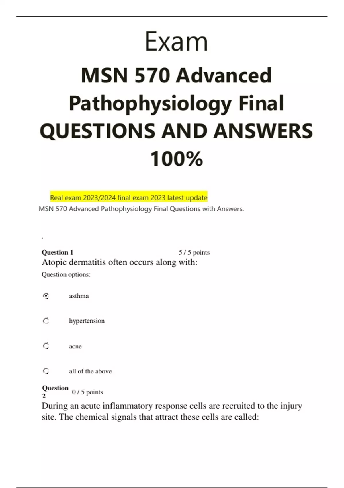 MSN 570 Advanced Pathophysiology Final Questions with Answers. . Question 1 5 / 5 points Atopic dermatitis often occurs along with: Question options: asthma hypertension acne Question 2 all of the above 0 / 5 points During an acute inflammatory response cells are recruited to the injury site. The chemical signals that attract these cells are called: