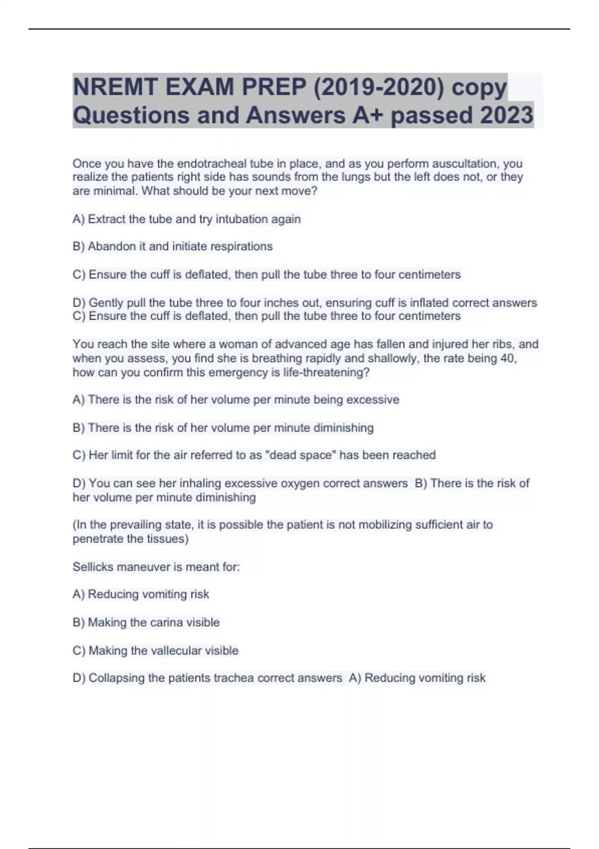 NREMT EXAM PREP Question and answers correctly solved 2023/2024Once you have the endotracheal tube in place, and as you perform auscultation, you realize the patients right side has sounds from the lungs but the left does not, or they are minimal. What should be your next move? A) Extract the tube and try intubation again B) Abandon it and initiate respirations C) Ensure the cuff is deflated, then pull the tube three to four centimeters D) Gently pull the tube three to four inches out, ensuring cuff is inflated correct answers C) Ensure the cuff is deflated, then pull the tube three to four centimeters You reach the site where a woman of advanced age has fallen and injured her ribs, and when you assess, you find she is breathing rapidly and shallowly, the rate being 40, how can you confirm this emergency is life-threatening? A) There is the risk