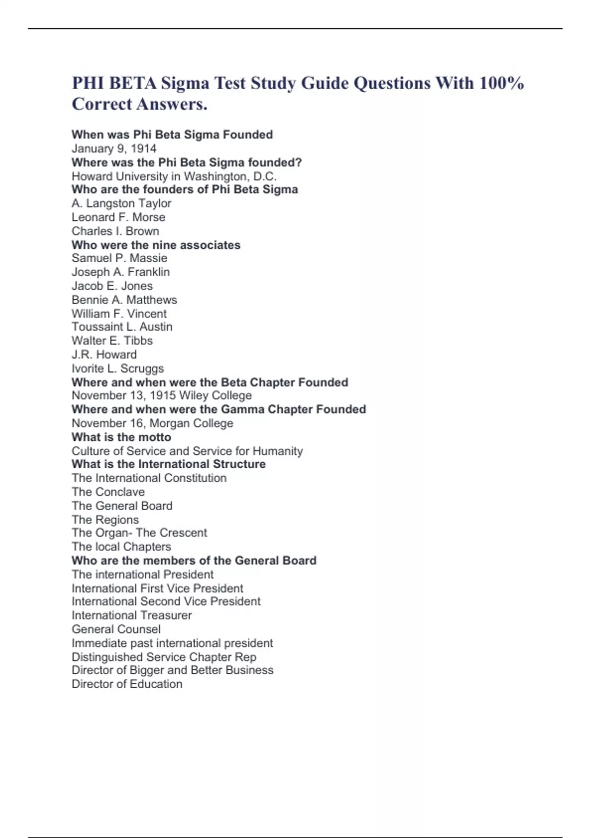 PHI BETA Sigma Test Study Guide Questions With 100% Correct Answers. When was Phi Beta Sigma Founded January 9, 1914 Where was the Phi Beta Sigma founded? Howard University in Washington, D.C. Who are the founders of Phi Beta Sigma A. Langston Taylor Leonard F. Morse Charles I. Brown Who were the nine associates Samuel P. Massie Joseph A. Franklin Jacob E. Jones Bennie A. Matthews William F. Vincent Toussaint L. Austin Walter E. Tibbs J.R. Howard Ivorite L. Scruggs Where and when were the Beta Chapter Founded November 13, 1915 Wiley College Where and when were the Gamma Chapter Founded November