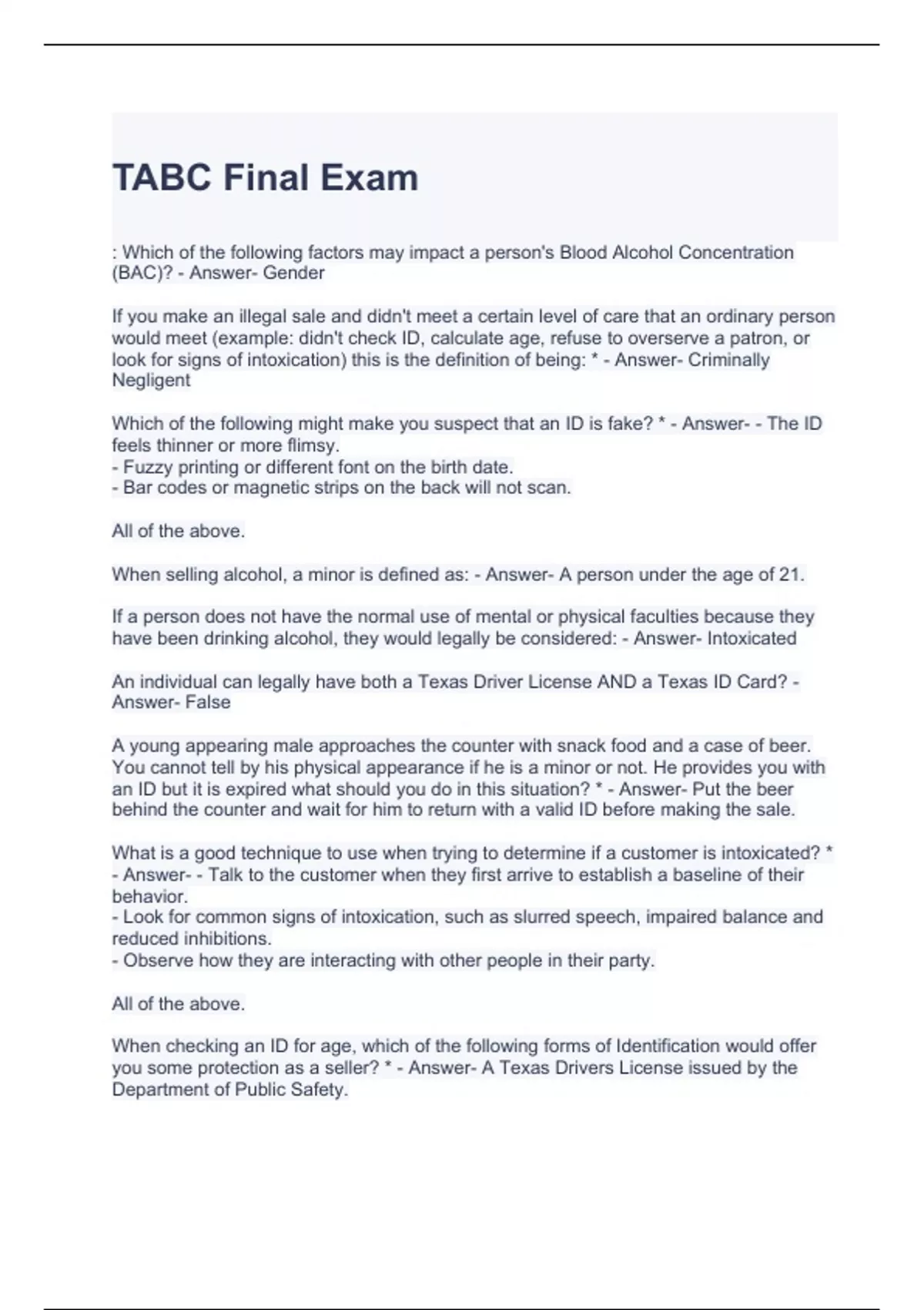 TABC Final Exam Questions and Answers