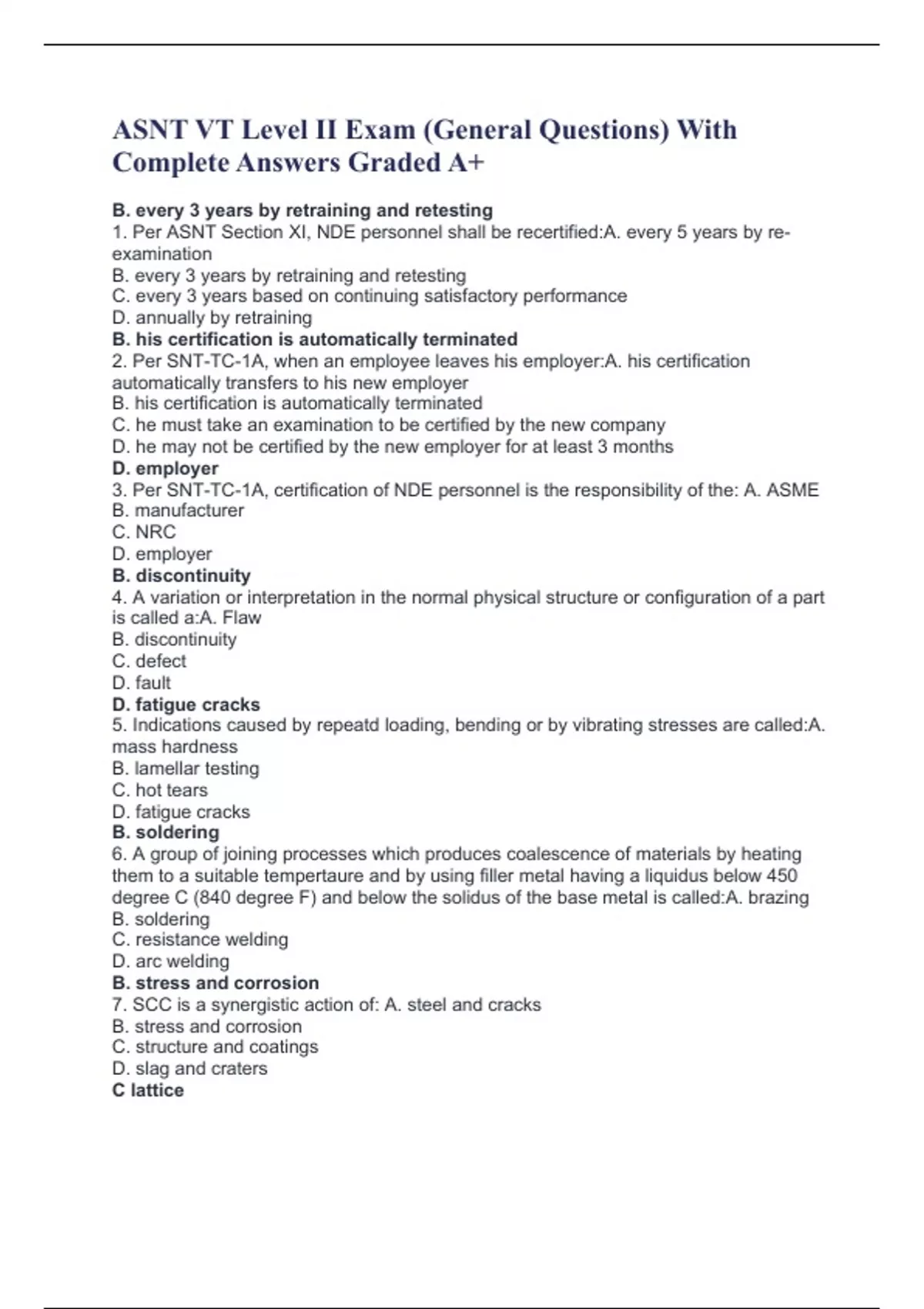 ASNT VT Level II Exam (General Questions) With Complete Answers Graded A+ B. every 3 years by retraining and retesting 1. Per ASNT Section XI, NDE personnel shall be recertified:A. every 5 years by re-examination B. every 3 years by retraining and retesting C. every 3 years based on continuing satisfactory performance D. annually by retraining B. his certification is automatically terminated 2. Per SNT-TC-1A, when an employee leaves his employer:A. his certification automatically transfers to his new employer B. his certification is automatically terminated C. he must take an examination to be certified by the new company D. he may not be certified by the new employer for at least 3 months D. employer 3. Per SNT-TC-1A, certification of NDE personnel is the responsibility of the: A. ASME B. manufacturer C. NRC D. employer B. discontinuity 4. A variation or interpretation