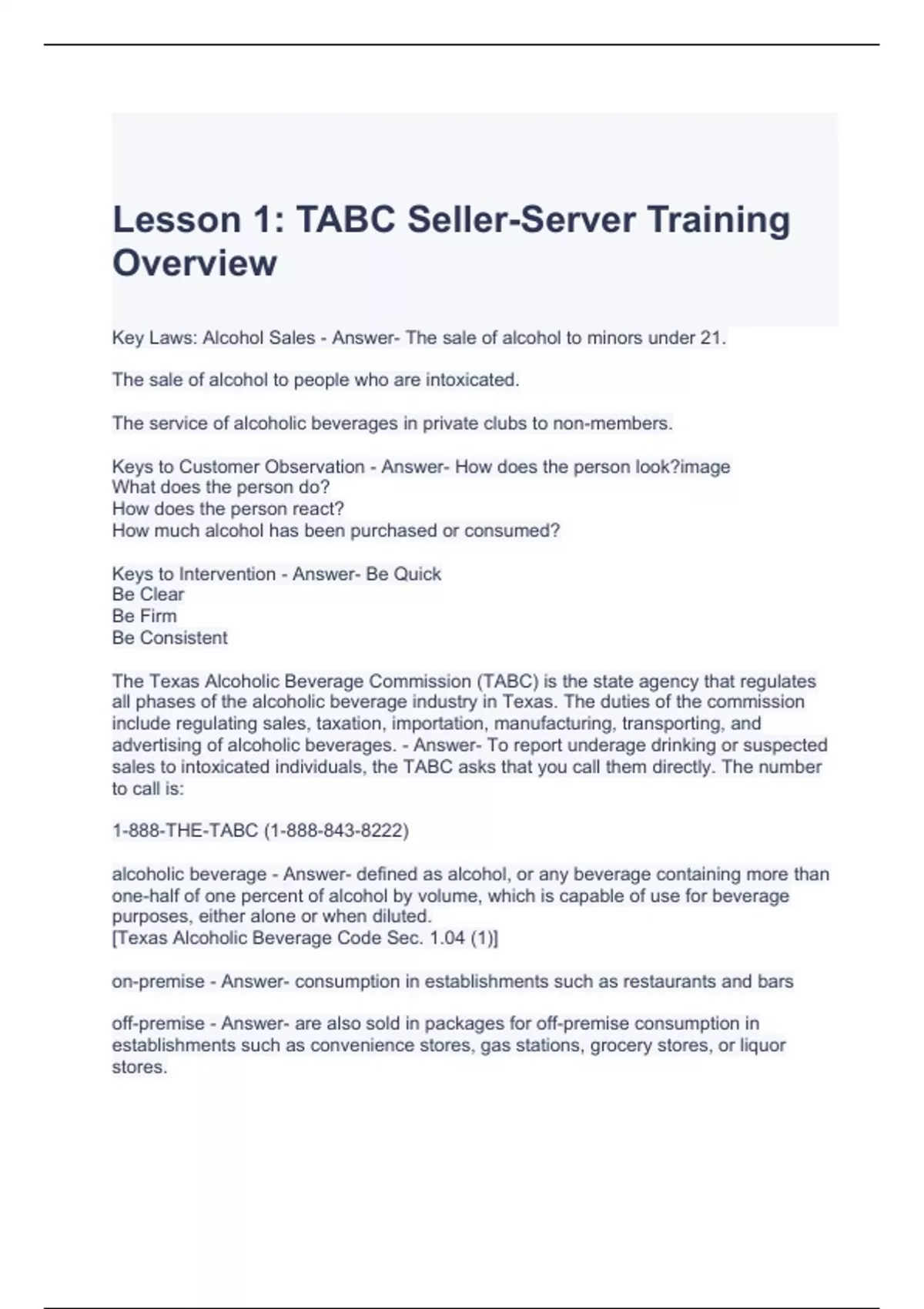 Lesson 1 TABC Seller-Server Training Overview Exam Questions and Answers