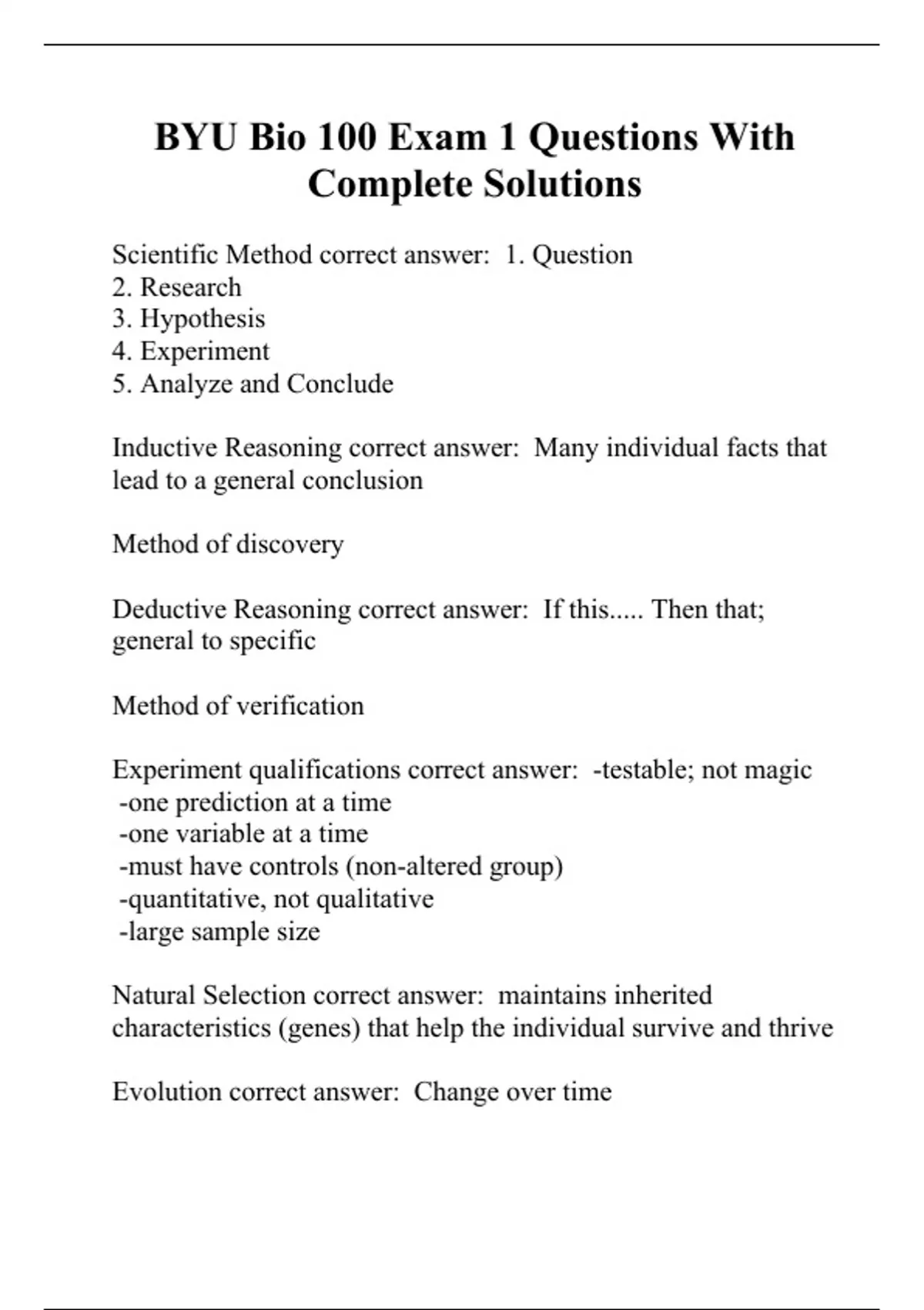 BYU Bio 100 Exam 1 Questions With Complete Solutions