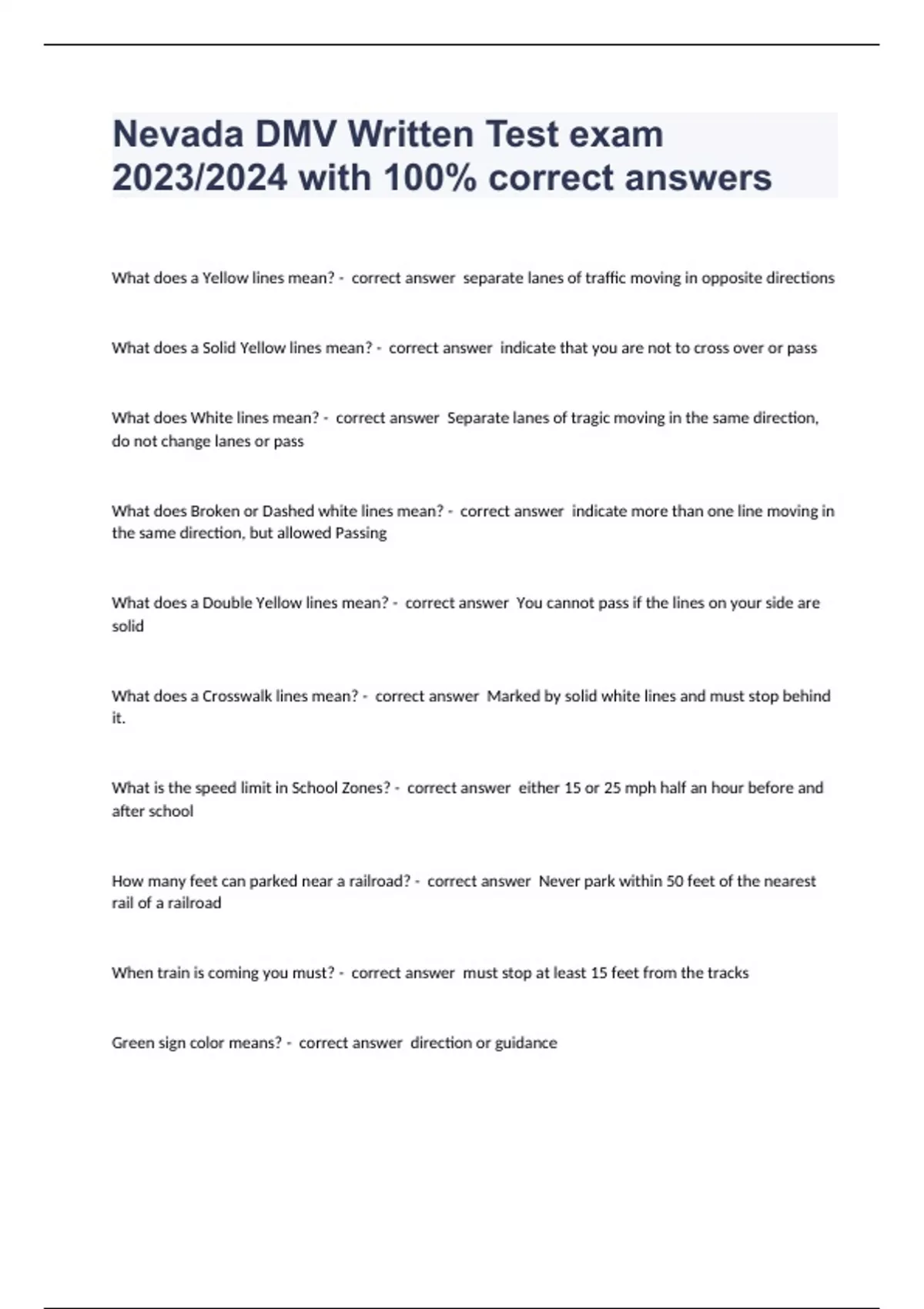 Nevada DMV Written Test exam 2023/2024 with 100% correct answers