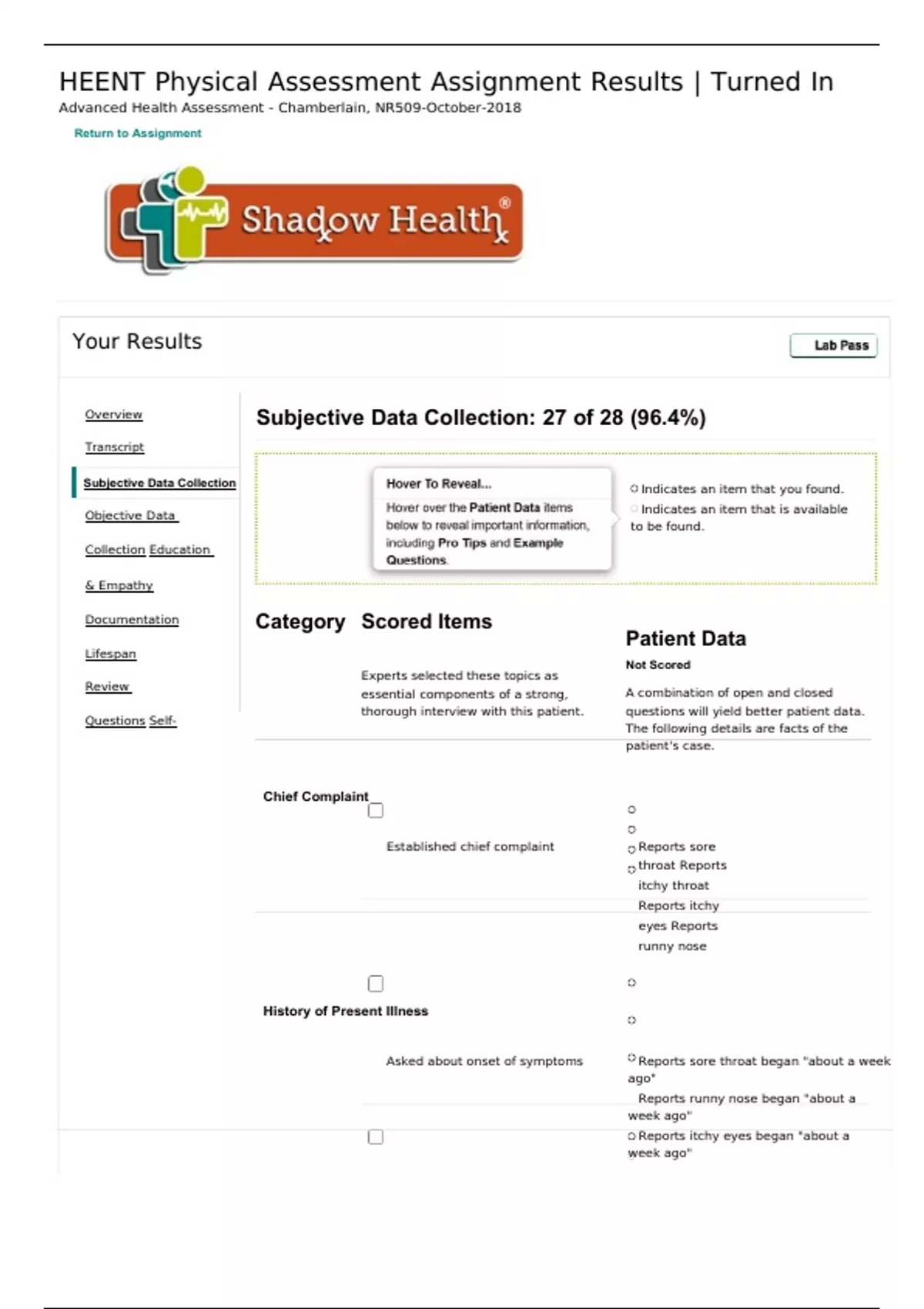 HEENT Physical Assessment Assignment Results | Turned In Advanced Health Assessment - Chamberlain, NR509-October-2018 Return to Assignment Your Results Subjective Data Collection: 27 of 28 (96.4%) Indicates an item that you found. Indicates an item that is available to be found. Category Scored Items Experts selected these topics as essential components of a strong, thorough interview with this patient. Patient Data Not Scored A combination of open and closed questions will yield better patient data. The following details are facts of the patient's case. Chief Complaint Established chief complaint Reports sore throat Reports itchy throat Reports itchy eyes Reports runny nose History of Present Illness Asked about onset of symptoms Reports sore throat began "about a week ago" Reports runny nose began "about a week ago" Reports itchy eyes began "about a week ago" Asked about aggravating factors for throat s©ymSphtoamdosw Health® 2018 Reports throat pain is constant Reports throat pain is worse in the morning Reports some soreness with swallowing Asked severity of throat discomfort Describes sore throat as mild to moderate Asked about frequency and duration of runny nose Reports nose is runny "pretty much all day" Asked about character of nasal symptoms Denies itchy nose Denies sinus pain Denies sinus pressure Denies sneezing Followed up about character of nasal discharge Reports clear discharge Reports thin discharge Denies purulent discharge Asked about eye symptoms Reports eye itching is constant Reports eye redness Asked related respiratory symptoms Reports breathing isn't affected Denies cough Denies chest tightness Asked about related asthma symptoms Denies recent wheezing Denies increase in recent asthma symptoms Asked about exposure to allergens Reports no exposure to cats Reports no exposure to mold or mildew Reports no exposure to dust Reports no known exposure to irritants in work environment Reports changing bedding "once a week" Asked about perceived cause of symptoms Describes symptoms as similar to allergies Reports that the symptoms don't seem like a common cold Describes similarity to her sister's hay fever symptoms Reports no history of cigarette smoking Reports no recent exposure to secondhand smoke Medical History Confirmed use of medications Confirmed medications from previous visit (no new medications) Followed up about inhaler use Uses an inhaler to treat asthma symptoms Inhaler is Proventil Last use of inhaler was last week Reports typical inhaler use is 2 - 3 times a week Reports using 2 - 3 puffs of inhaler when used Prescribed dosage is 2 puffs Followed up about medications and relieving factors for nose and eye symptoms Reports no treatment for itchy eyes Reports no treatment for nasal symptoms Reports no antihistamine Reports no decongestant Followed up about medications and relieving factors for throat symptoms Reports lozenges as treatment Reports lozenges reduce symptoms Reports ingesting lozenges every few hours Reports drinking water reduces symptoms