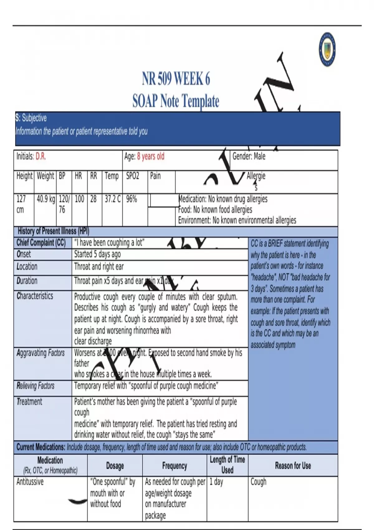 NR 509 WEEK 6 SOAP Note Template Initials: D.R. Age: 8 years old Gender: Male Height Weight BP HR RR Temp SPO2 Pain Allergies 127 cm 40.9 kg 120/ 76 100 28 37.2 C 96% Medication: No known drug allergies Food: No known food allergies Environment: No known environmental allergies History of Present Illness (HPI) Chief Complaint (CC) “I have been coughing a lot” CC is a BRIEF statement identifying why the patient is here - in the patient’s own words - for instance "headache", NOT "bad headache for 3 days”. Sometimes a patient has more than one complaint. For example: If the patient presents with cough and sore throat, identify which is the CC and which may be an associated symptom Onset Started 5 days ago Location Throat and right ear Duration Throat pain x5 days and ear pain x1 day Characteristics Productive cough every couple of minutes with clear sputum. Describes his cough as “gurgly and watery” Cough keeps the patient up at night. Cough is accompanied by a sore throat, right ear pain and worsening rhinorrhea with clear discharge Aggravating Factors Worsens at 2100 every night. Exposed to second hand smoke by his father who smokes a cigar in the house multiple times a week. Relieving Factors Temporary relief with “spoonful of purple cough medicine” Treatment Patient’s mother has been giving the patient a “spoonful of purple cough medicine” with temporary relief. The patient has tried resting and drinking water without relief, the cough “stays the same” Current Medications: Include dosage, frequency, length of time used and reason for use; also include OTC or homeopathic products. Medication (Rx, OTC, or Homeopathic) Dosage Frequency Length of Time Used Reason for Use Antitussive “One spoonful” by mouth with or without food As needed for cough per age/weight dosage on manufacturer package 1 day Cough Multivitamin One gummy by mouth with or without food Daily Unknown Supplement Click or tap here to enter text. Click or tap here to enter text. Click or tap here to enter text. Click or tap here to enter text. Click or tap here to enter text. Click or tap here to enter text. Click or tap here to Click or tap here to enter Click or tap here Click or tap here to enter text.