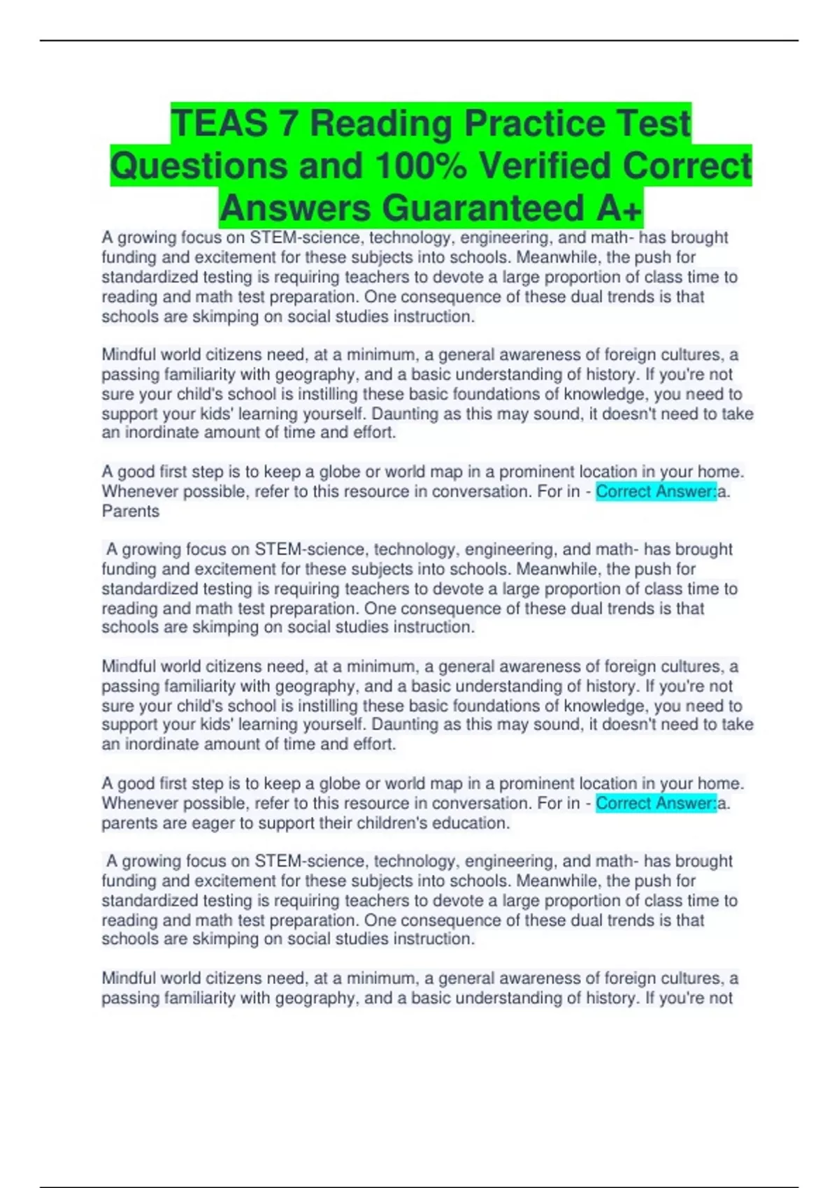 TEAS 7 Reading Practice Test Questions and 100% Verified Correct Answers Guaranteed A+