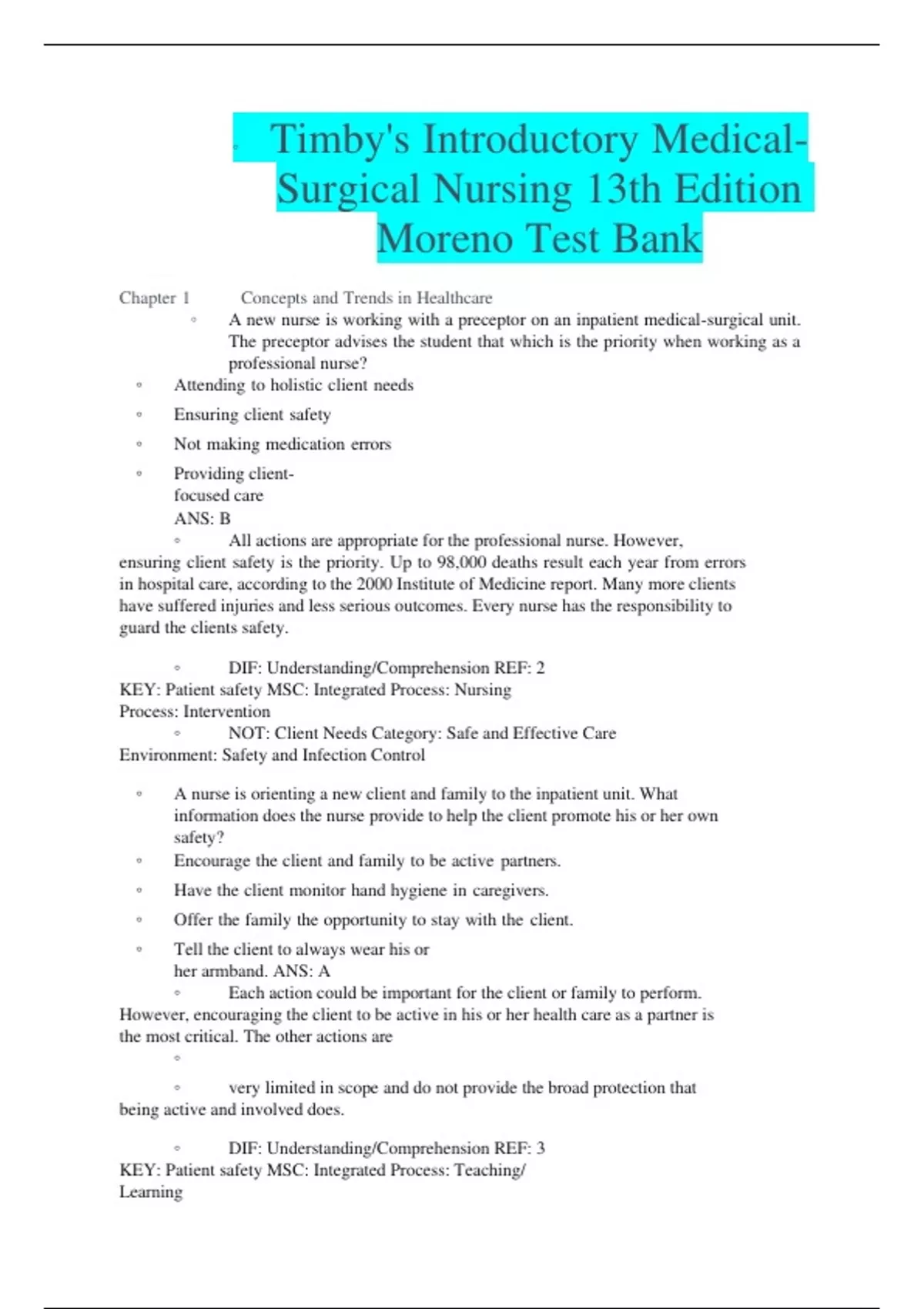 Timby's Introductory Medical-Surgical Nursing 13th Edition Moreno Test Bank