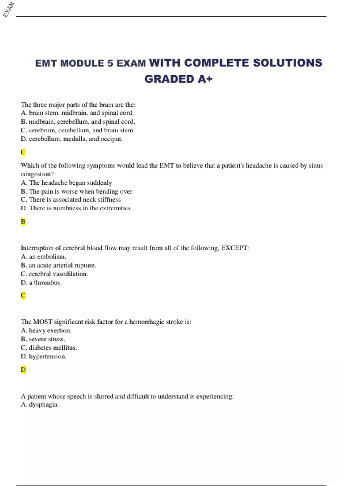 EMT (EMERGENCY MEDICAL TECHNICIAN) MODULE 5 EXAM WITH COMPLETE SOLUTIONS GRADED A The three major parts of the brain are the: A. brain stem, midbrain, and spinal cord. B. midbrain, cerebellum, and spinal cord. C. cerebrum, cerebellum, and brain stem. D. cerebellum, medulla, and occiput. C Which of the following symptoms would lead the EMT to believe that a patient's headache is caused by sinus congestion? A. The headache began suddenly B. The pain is worse when bending over C. There is associated neck stiffness D. There is numbness in the extremities