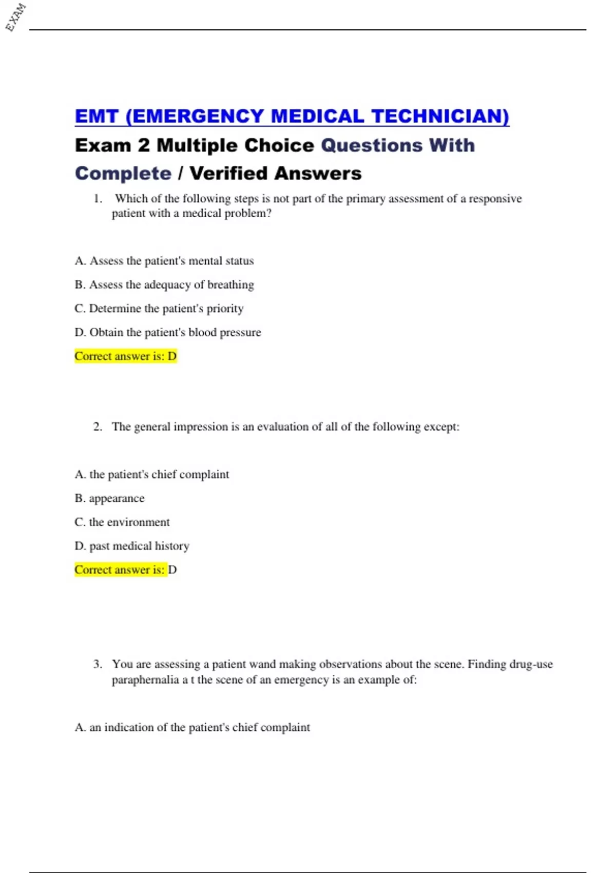 EMT (EMERGENCY MEDICAL TECHNICIAN) Exam 2 Multiple Choice Questions With Complete / Verified Answers 1. Which of the following steps is not part of the primary assessment of a responsive patient with a medical problem? A. Assess the patient's mental status B. Assess the adequacy of breathing C. Determine the patient's priority D. Obtain the patient's blood pressure Correct answer is: D 2. The general impression is an evaluation of all of the following except: A. the patient's chief complaint B. appearance C. the environment D. past medical history Correct answer is: D