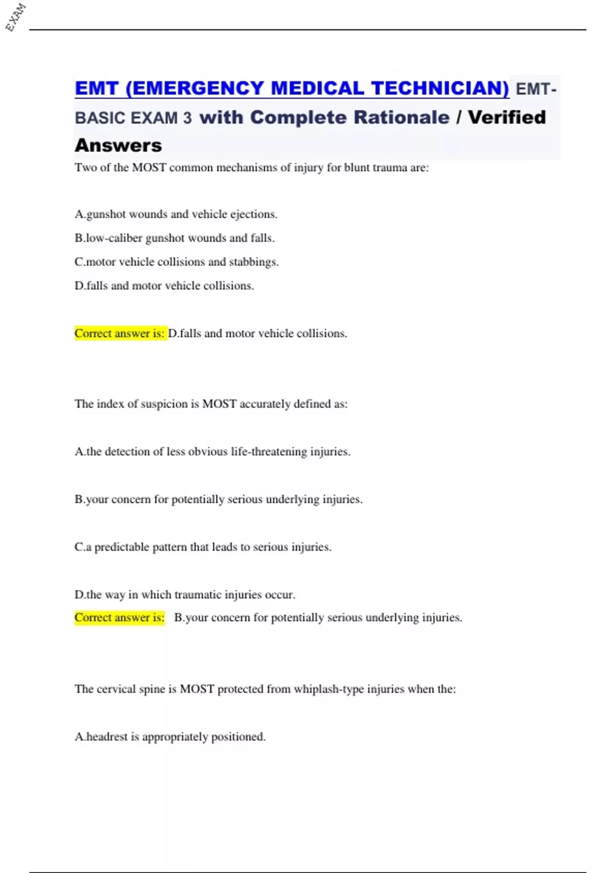 EMT (EMERGENCY MEDICAL TECHNICIAN) EMT-BASIC EXAM 3 with Complete Rationale / Verified Answers Two of the MOST common mechanisms of injury for blunt trauma are: A.gunshot wounds and vehicle ejections. B.low-caliber gunshot wounds and falls. C.motor vehicle collisions and stabbings. D.falls and motor vehicle collisions. Correct answer is: D.falls and motor vehicle collisions. The index of suspicion is MOST accurately defined as: A.the detection of less obvious life-threatening injuries. B.your concern for potentially serious underlying injuries. C.a predictable pattern that leads to serious injuries