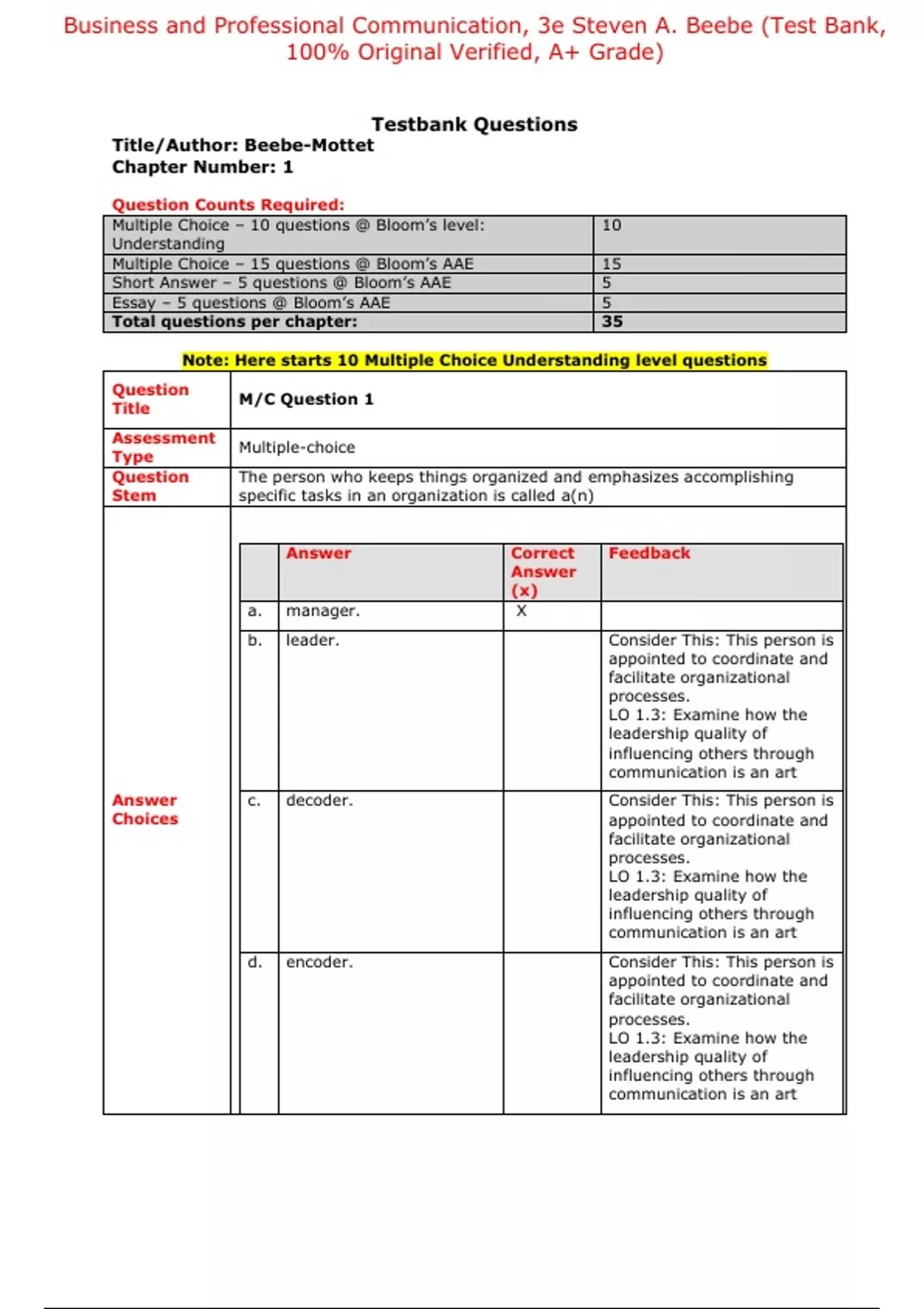 Test Bank For Business and Professional Communication 3rd Edition By Steven A. Beebe (All Chapters, 100% original verified, A+ Grade)